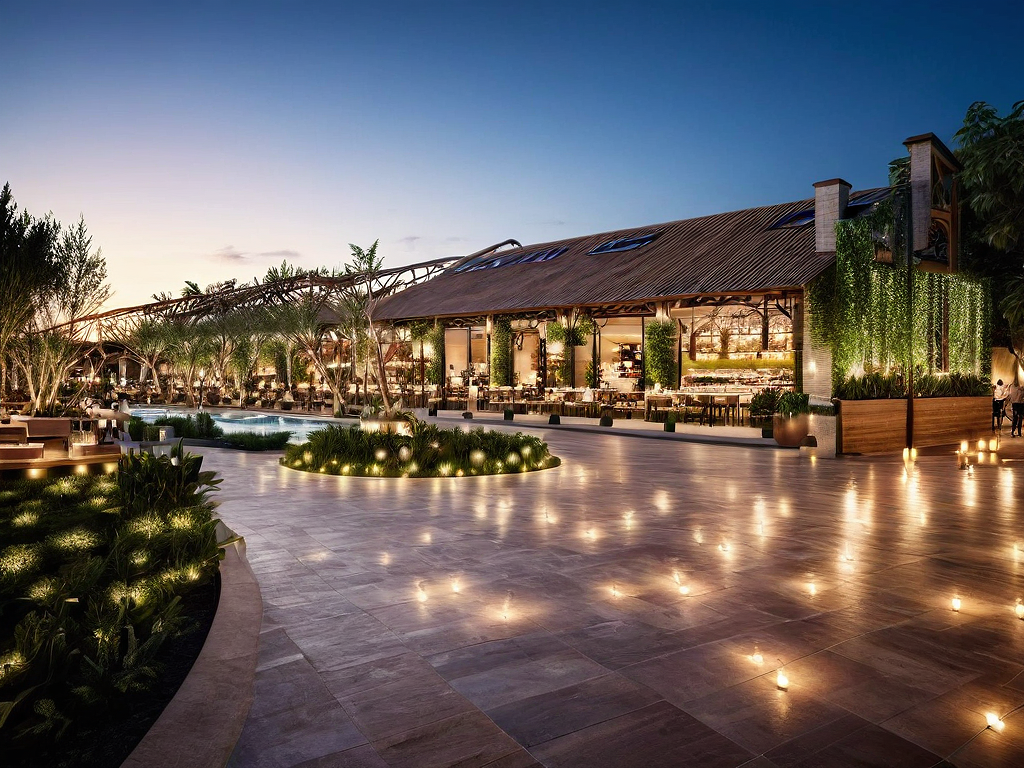 food hall, amazing garden, same construction materials, same facade, amazing terrace, sunset