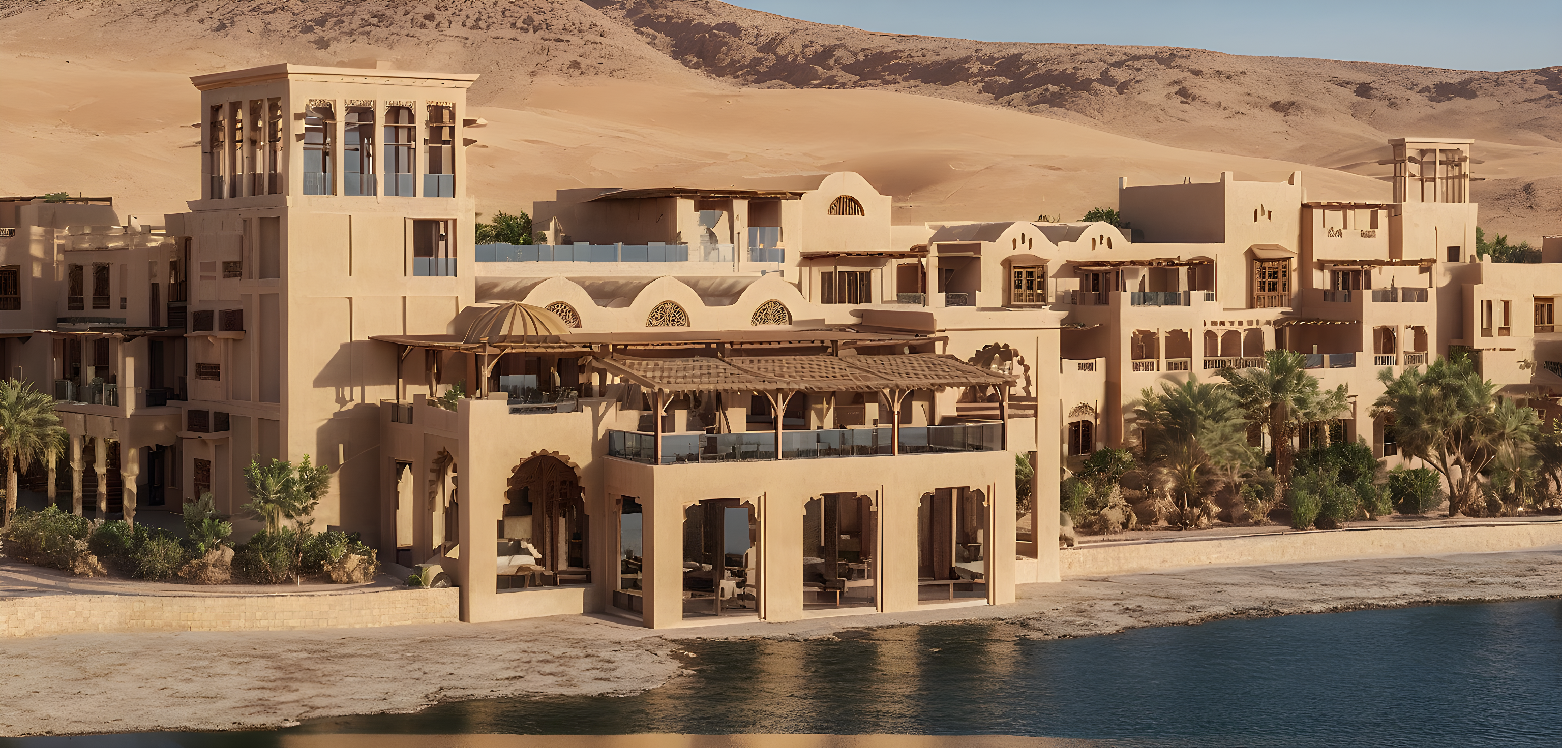 Promptbeige mudhouse facade arabian boutique hotel with lake infront of it in a desert resort
