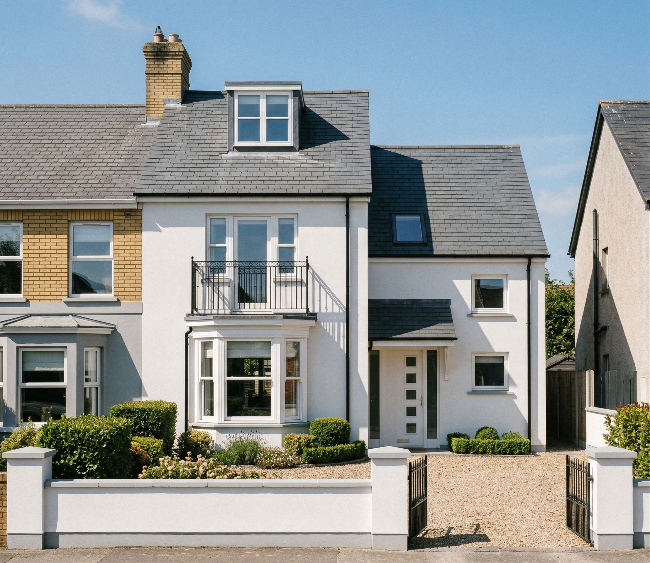 PromptSemi detached house referee and side extension set back from frontage, slate roof, white render walls, 1 velux roof light in side addition. low white painted wall to frontage as reference image 1. Adjoining house has yellow brick to first floor, grey render below. Mice sunny day , shrubs in front garden, keep exact camera angle