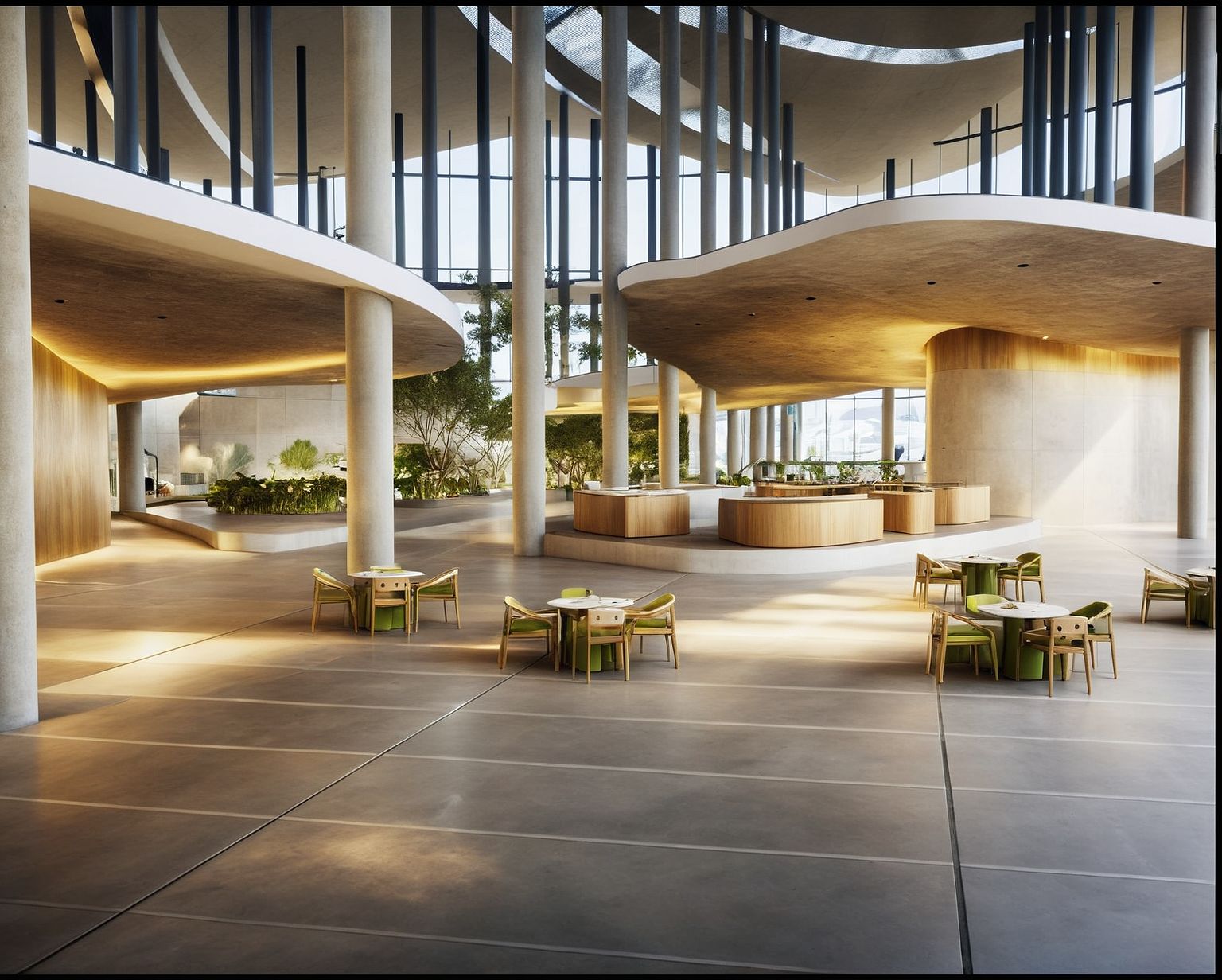 Promptmodern airport terminal, two levels building, double volume curved ceiling with skylight, shops booths with curved ceiling, airport duty free area, seating area, landscape garden , concrete columns, certain walls, glass facades, soft whites 60% olive greens 30% soft yellows 10% color palette, realistic results, high quality materials, natural daytime, daytime mode sky