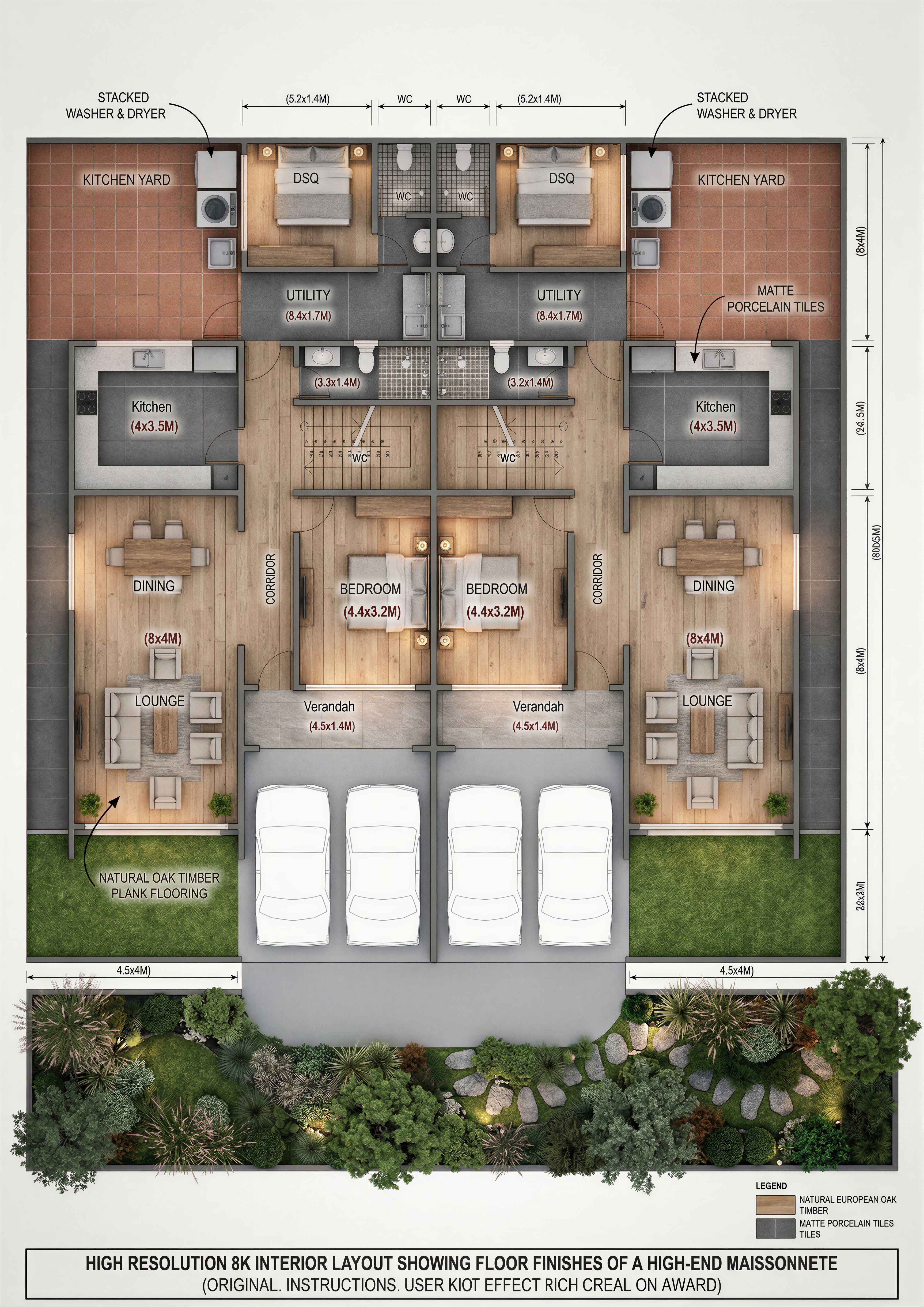 LAYOUT SHOWING THE INTERIOR OF A HIGH END MAISSONNETE. CLEARLY SHOW THE PARTITIONS WITH THE FLOOR FINISHES. USE TIMBER AND CERAMIC TILES ON THE FLOORS. INCLUDE A WASHER AND DRIER IN THE KITCHEN YARD AREA. CLEARLY INDICATE THE WASHROOMS. MAKE LAYOUT HIGH RESOLUTION OF 8K. SOME LANDSCAPING IN THE GREY AREA OUTSIDE THE LOUNGE WINDOW NEXT TO THE PARKING., keep exact camera angle