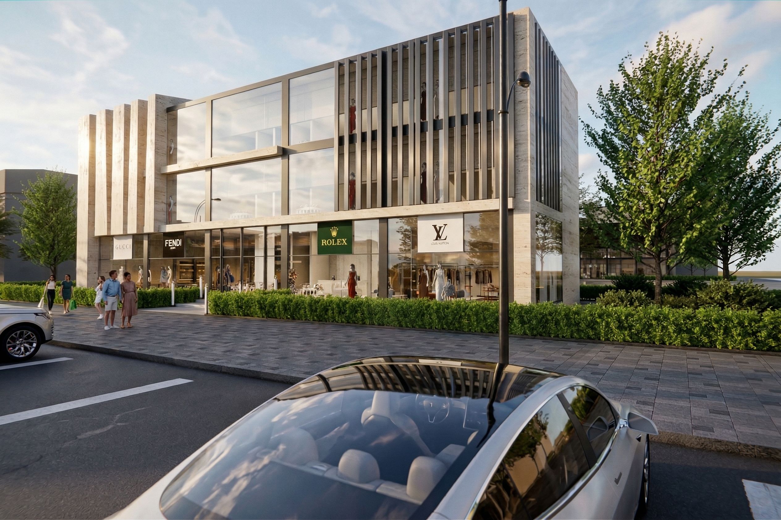 PromptEnhance this modern commercial building render to ultra photorealistic quality while keeping the exact original architecture, massing, proportions, and details unchanged. Do not modify the building design in any way.