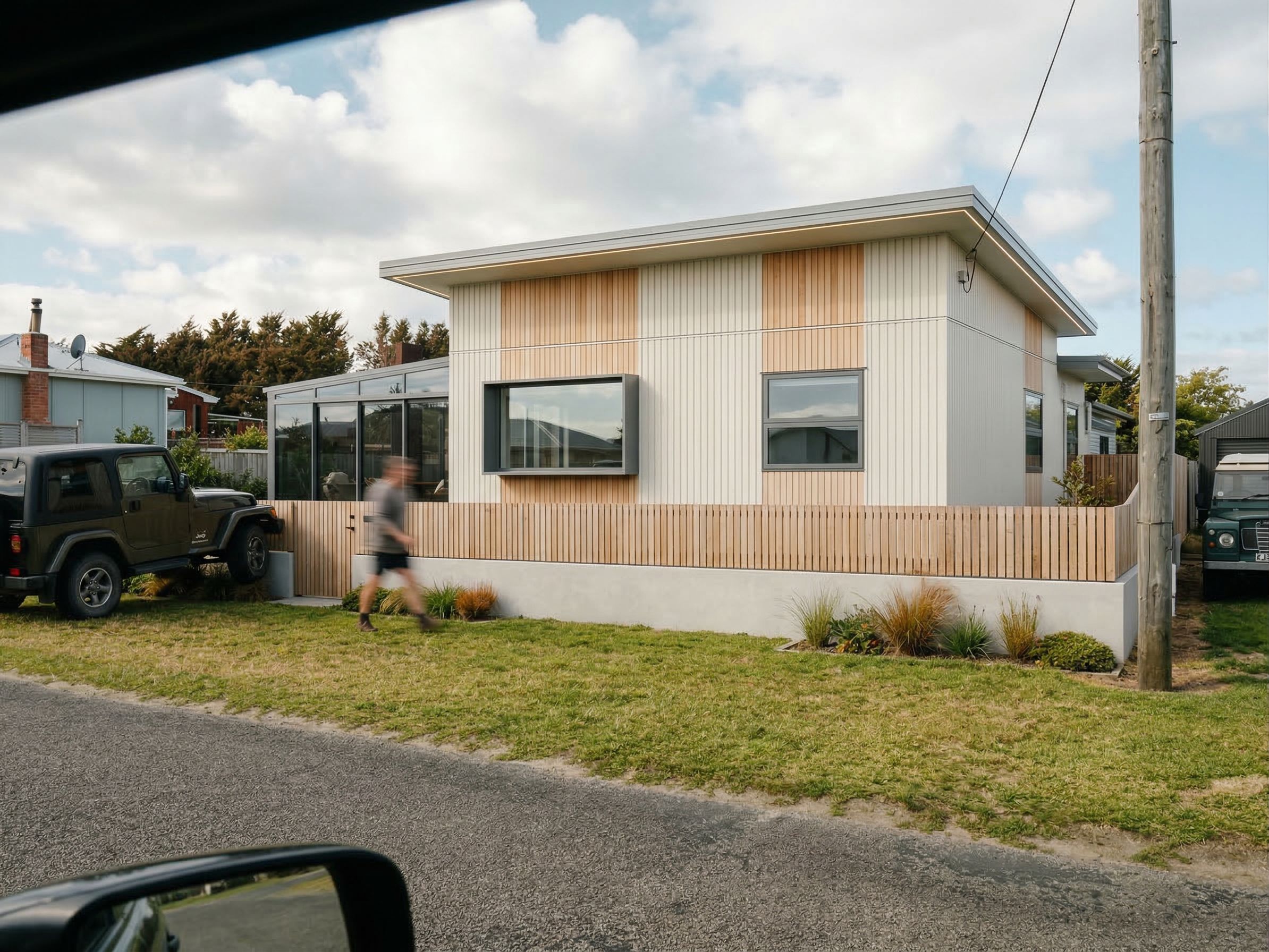 EnhancedPromptold cottage requiring a face lift. vertical grooved light coloured wall cladding. light coloured vertical cedar above and below windows. New grey aluminum windows. Left side window to project 400mm. aluminum and glass conservatory shown on left side of house. sloping roof with 400mm wide soffit. 600mm high retaining wall to front boundary with 1200mm wood paling fence above. vehicle gate to left side of conservatory. Sunny day with clouds., keep exact camera angle