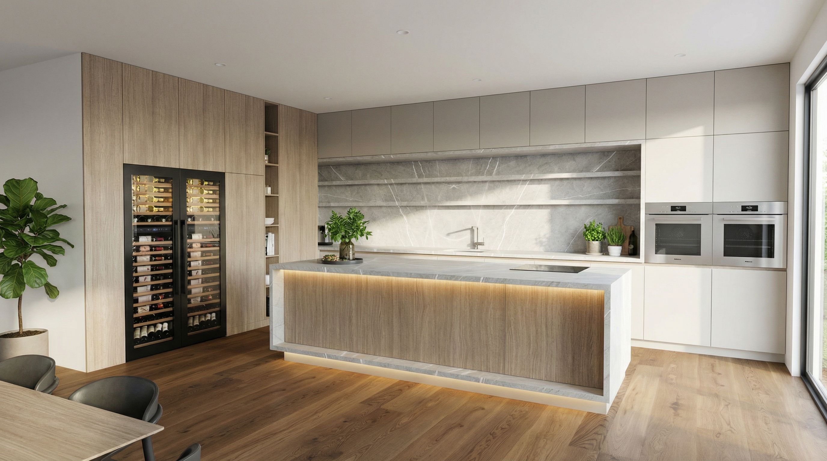 interior design rendering, render this wireframe into photorealistic rendering, interior design rendering, render this wireframe into photorealistic rendering, Photo of a modern kitchen interior, featuring a striking blend of textured light matt oak wood cabinetry and sleek marble surfaces, emphasizing clean lines and minimalist design. The space is enriched with stainless steel appliances, including built-in ovens. The floor showcases rich matt oak hardwood, providing warmth. Natural light filters gently through a window ont right side, casting subtle shadows across the countertops. LED lights on the kitchen island. Captured from a slightly elevated angle, with a wide lens, to convey an open and inviting atmosphere, highlighting the harmonious interplay of materials and light in this stylish culinary space., keep exact camera angle, bright daylight, natural lighting, including furniture, indoor plants, ambient lighting, high quality, professional, detailed scene, keep exact camera angle, including indoor plants, ambient lighting, high quality, professional, detailed scene