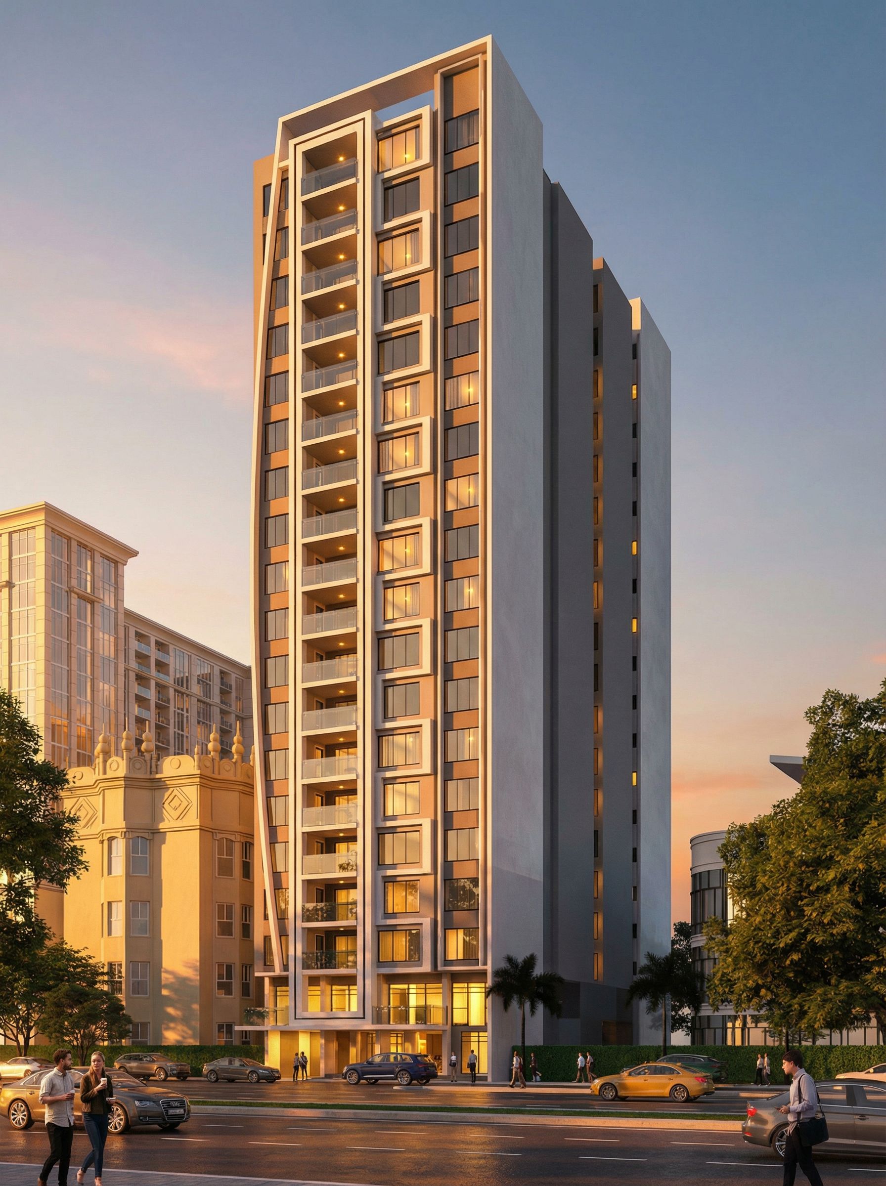 Promptarchitectural exterior rendering, render this photo into photorealistic rendering, MORNING SUMMER WITH SOME OF THE LIGHTS IN THE HOUSE TURNED ON. ALOT OF LIGHT ON THE FACADE OF THE BUILDING. BUSY STREET SCAPE WITH LOTS OF CARS AND PEOPLE. WARM ATMOSPHERE, dramatic low angle shot, golden hour warm lighting, including people, vehicles, high quality, professional, detailed scene