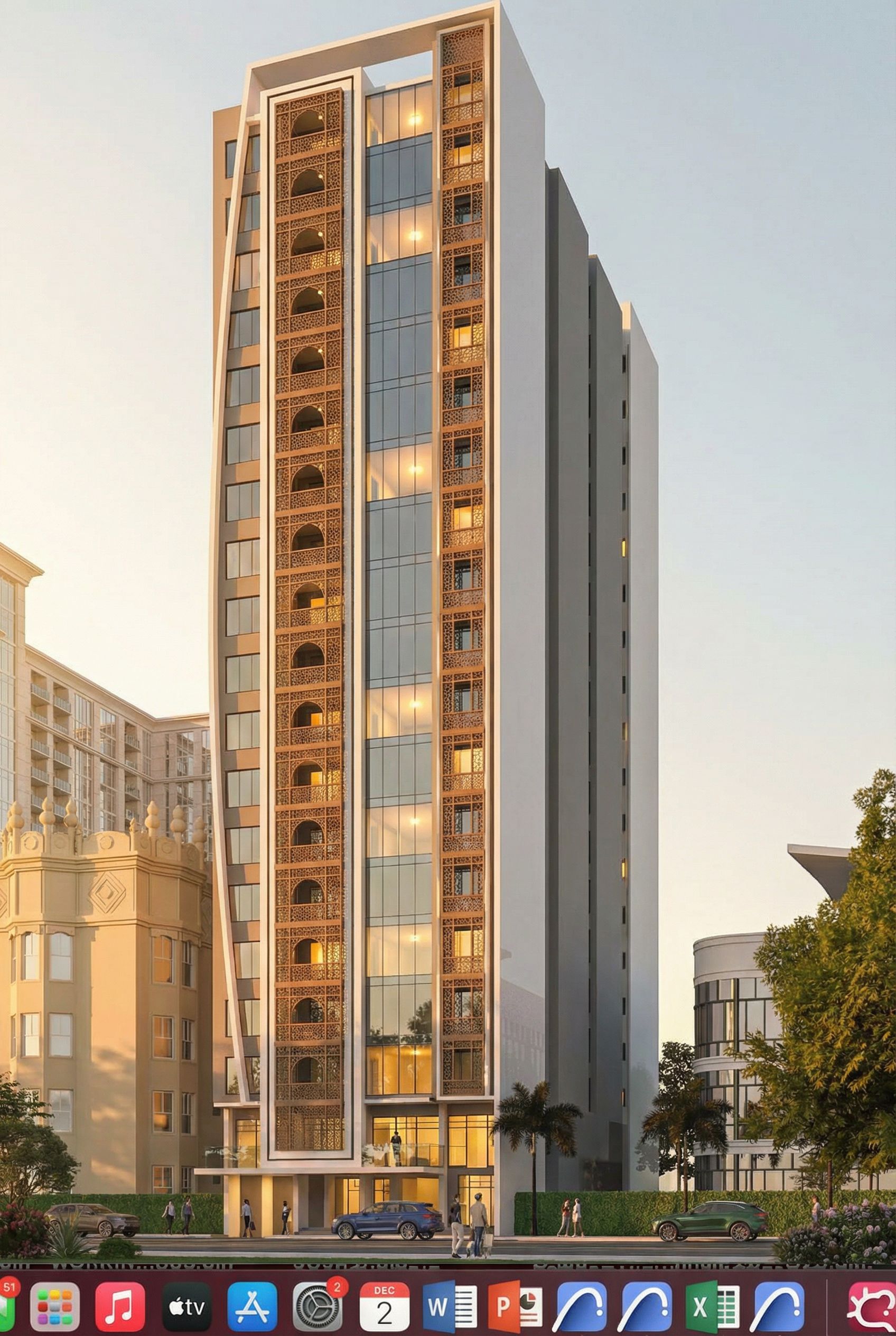 architectural exterior rendering, render this photo into photorealistic rendering, WARM SUMMER MORNING WITH SOME LIGHTS TURNED ON IN THE BUILDING. REDESIGN FACADE TO INCLUDE CURTAIN WALLING REPLACING THE WINDOWS IN THE MIDDLE. INCLUDE AN ARABIC LATTICE COVERING THE BALCONIES FROM TOP TO BOTTOM., keep exact camera angle, golden hour warm lighting, including people, vehicles, high quality, professional, detailed scene
