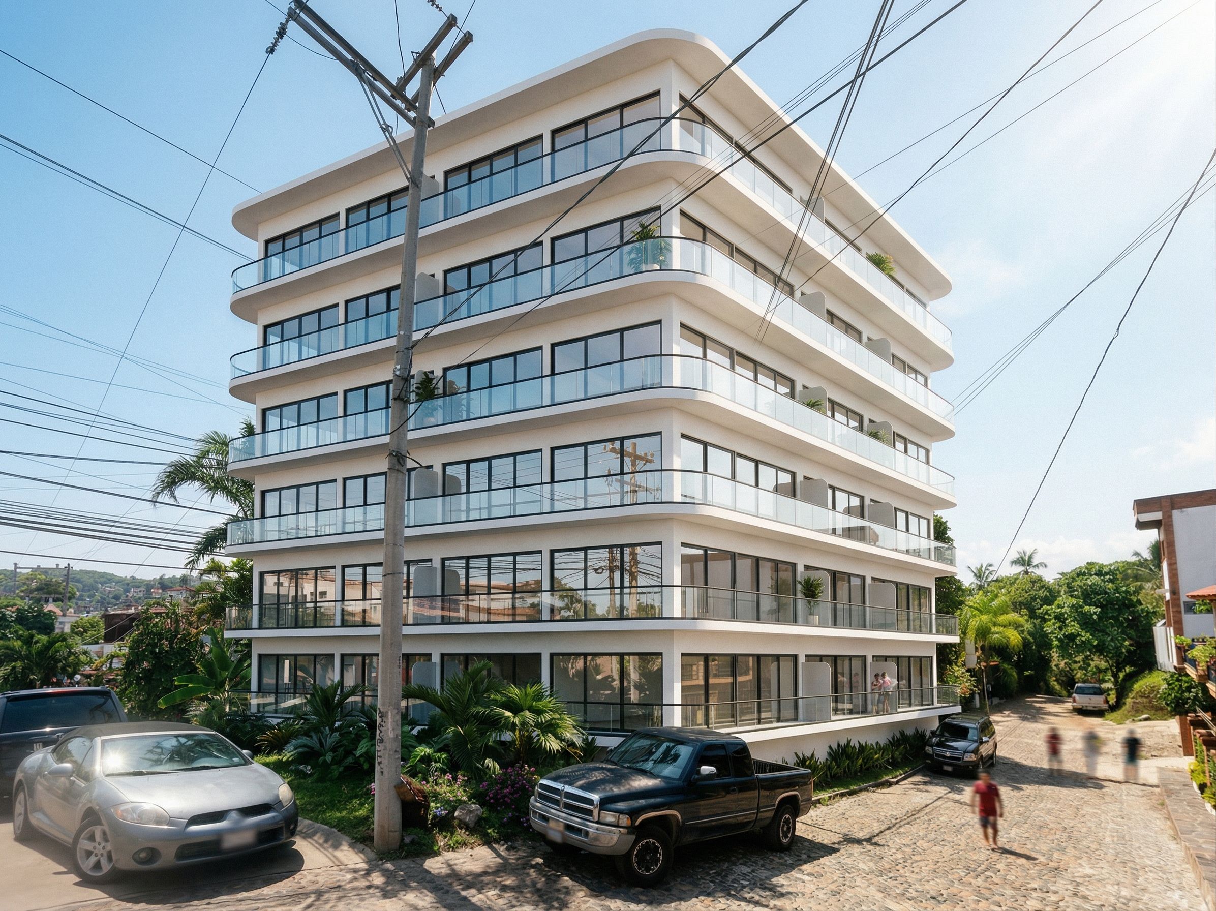 PromptPhoto of a modern multi-story residential building, with elegant glass balconies and large windows. Emphasizes the smooth white facade and contemporary architectural lines. The urban environment shows neighboring structures and green areas nearby, highlighting the details of the texture. Captures the scene from a low angle using a wide-angle lens, focusing on the interaction of light and reflections on the glass surfaces, showing the vibrant urban life surrounding the building. PLACE ON THE WHITE PART OF THE REFERENCE IMAGE, THE ENVIRONMENT IS RESPECTED
