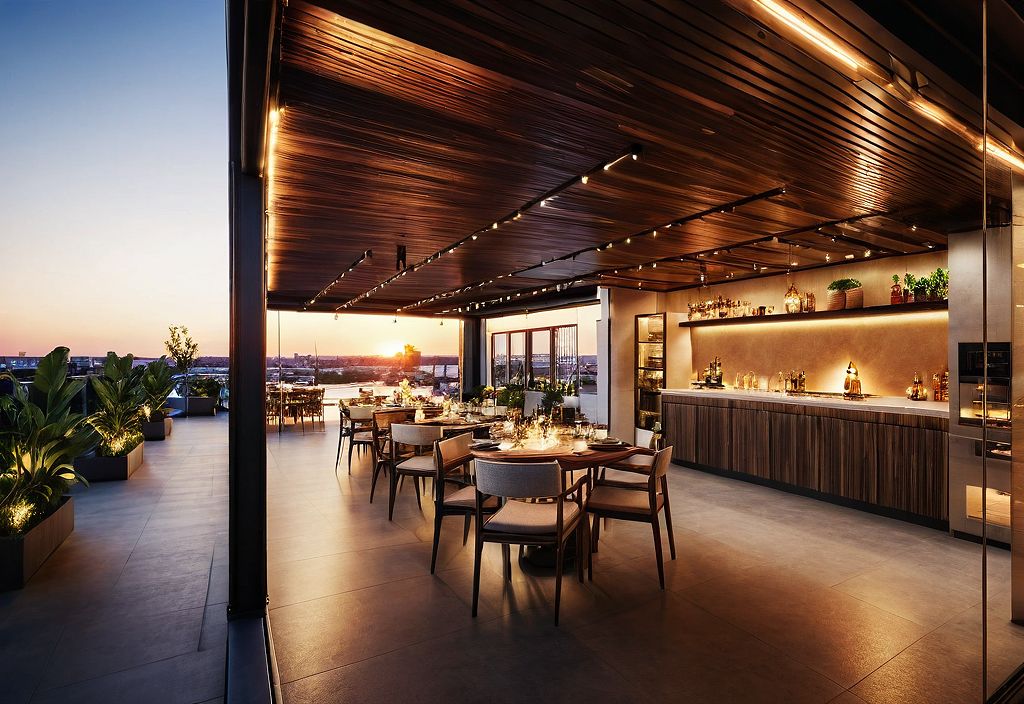 PromptGOURMET AREA IN A ROOFTOP., LOOKING TO A RIVER ON THE BACK, DURING A SUNSET