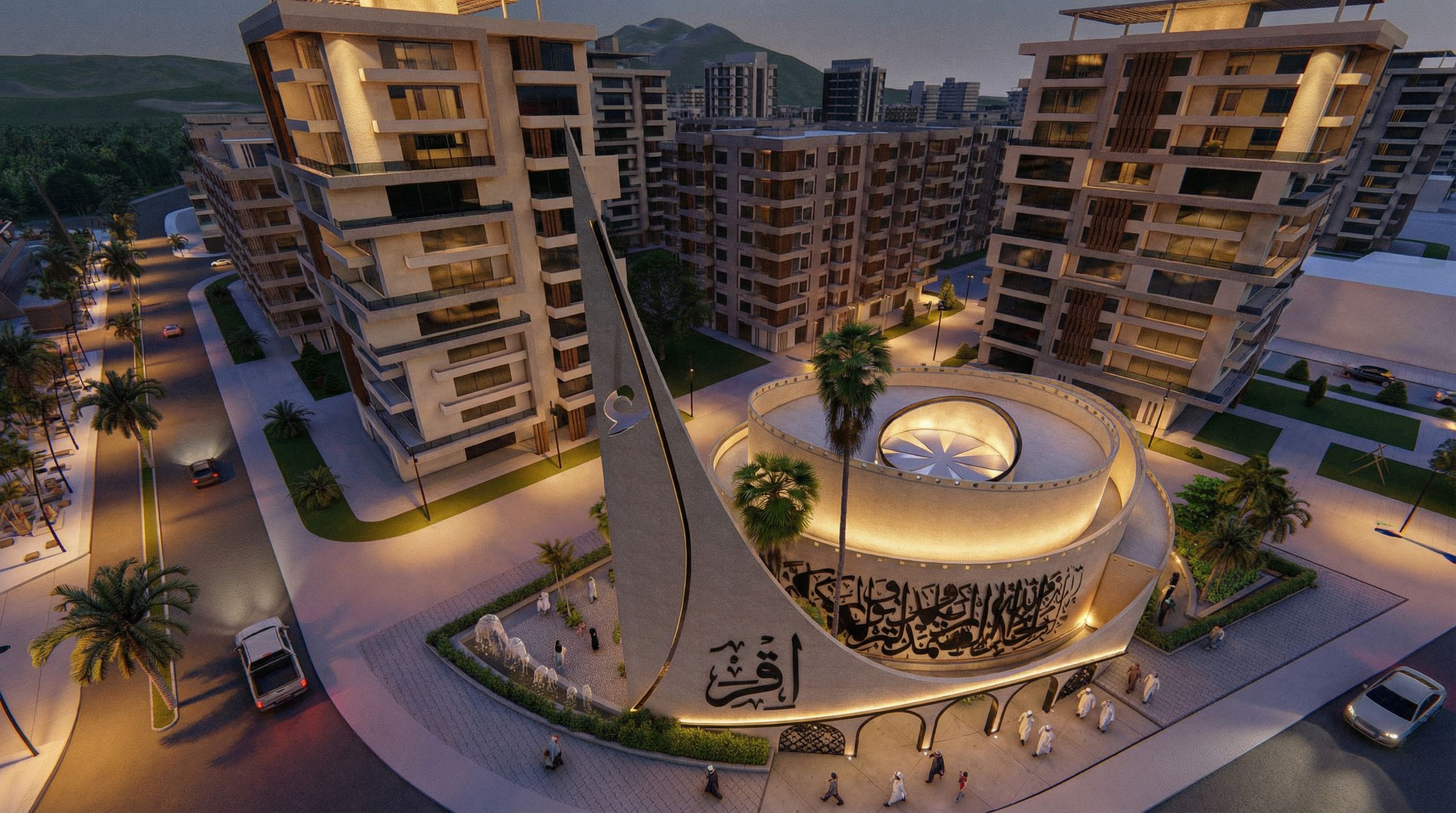 Photo of a contemporary MOSQUE, highlighted by smooth concrete surfaces and intricate calligraphy detailing on its façade. Surrounding, modern residential structures feature varying textures and materials, creating a rich urban landscape. Palm trees line the street, enhancing the OASIS feel. The scene is bathed in warm golden hour light, casting soft shadows and illuminating the building's architectural features. Captured from an aerial perspective with a wide-angle lens to encompass the harmonious integration of structure and environment, emphasizing depth and spatial relationships.
