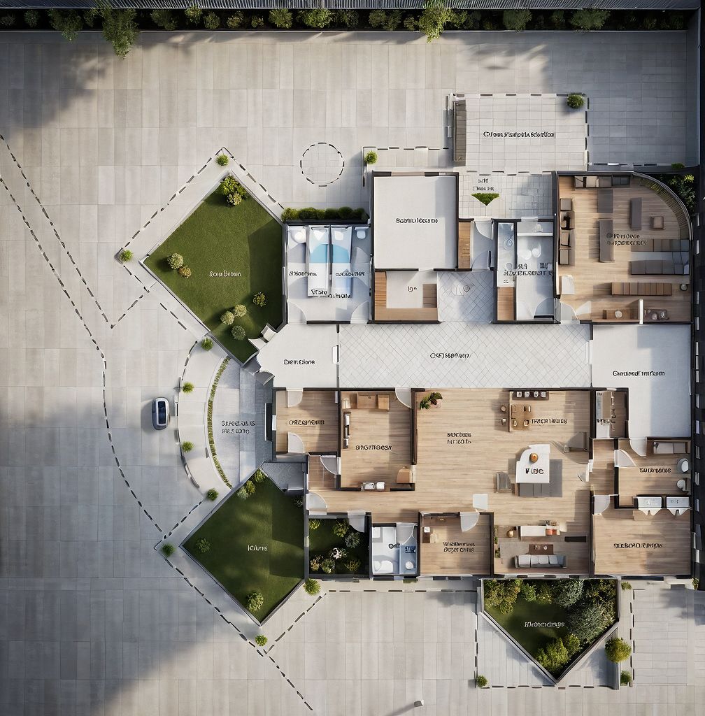 PromptFloor plan of a contemporary residential building featuring an open layout. Highlight clean lines in the design, distinctive room segmentation, and large windows enhancing natural light. Surrounding features include landscaped gardens and pathways that integrate with the home’s entrance. Time of day is midday with bright, natural lighting, casting soft shadows that accentuate structural details. Capture the scene from a bird's-eye view, using a wide-angle lens to encompass the entirety of the layout and its context within the urban setting.