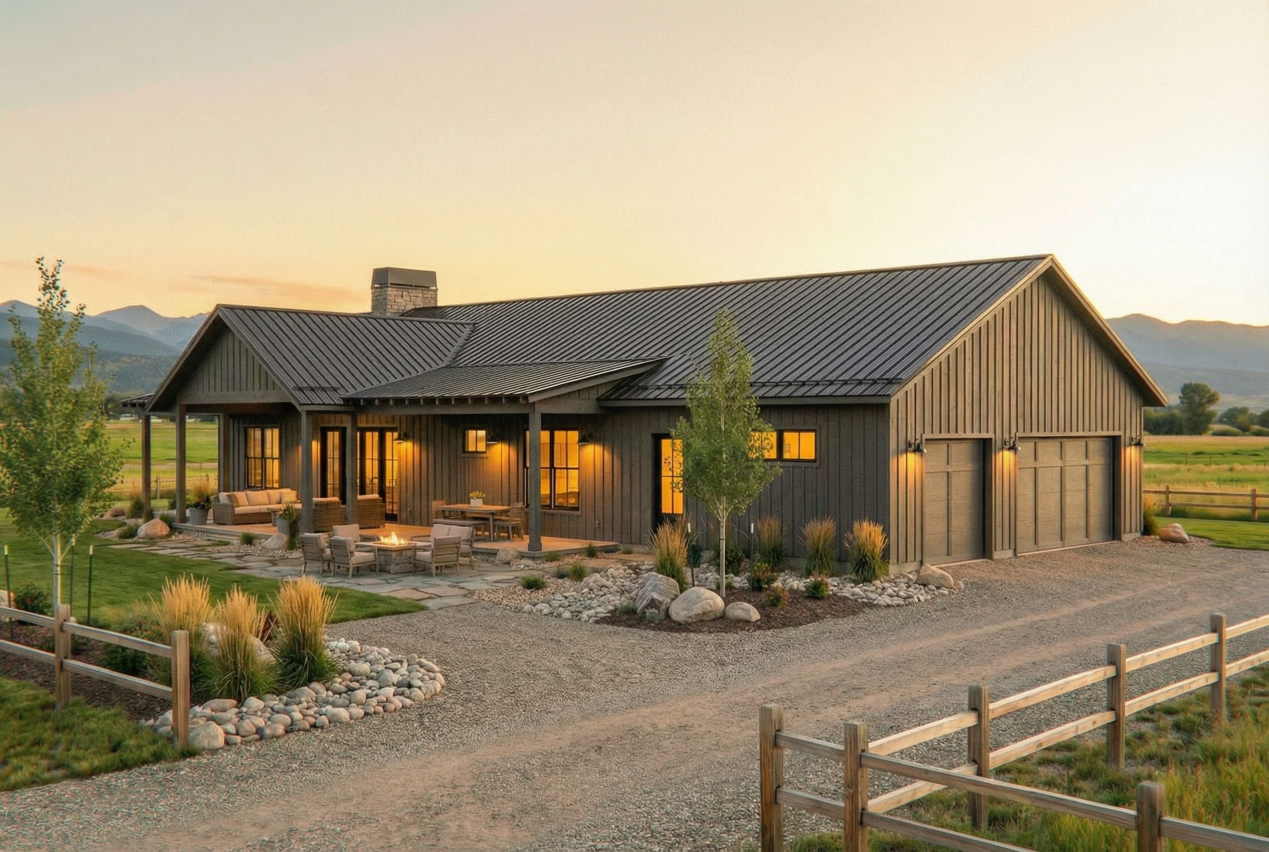 PromptEnclose the covered patio gable end as marked with blue lines. Replace blue lines with the same board and batten as shown on the rest of the building. Leave everything else exactly as it is., keep exact camera angle