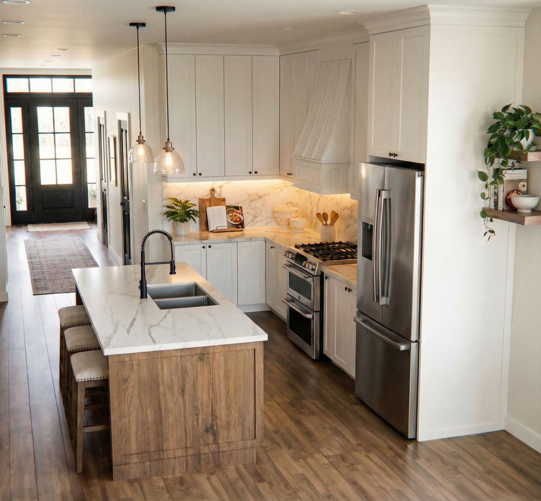 PromptPlease change the front door to black, add under valance lighting in kitchen, keep exact camera angle