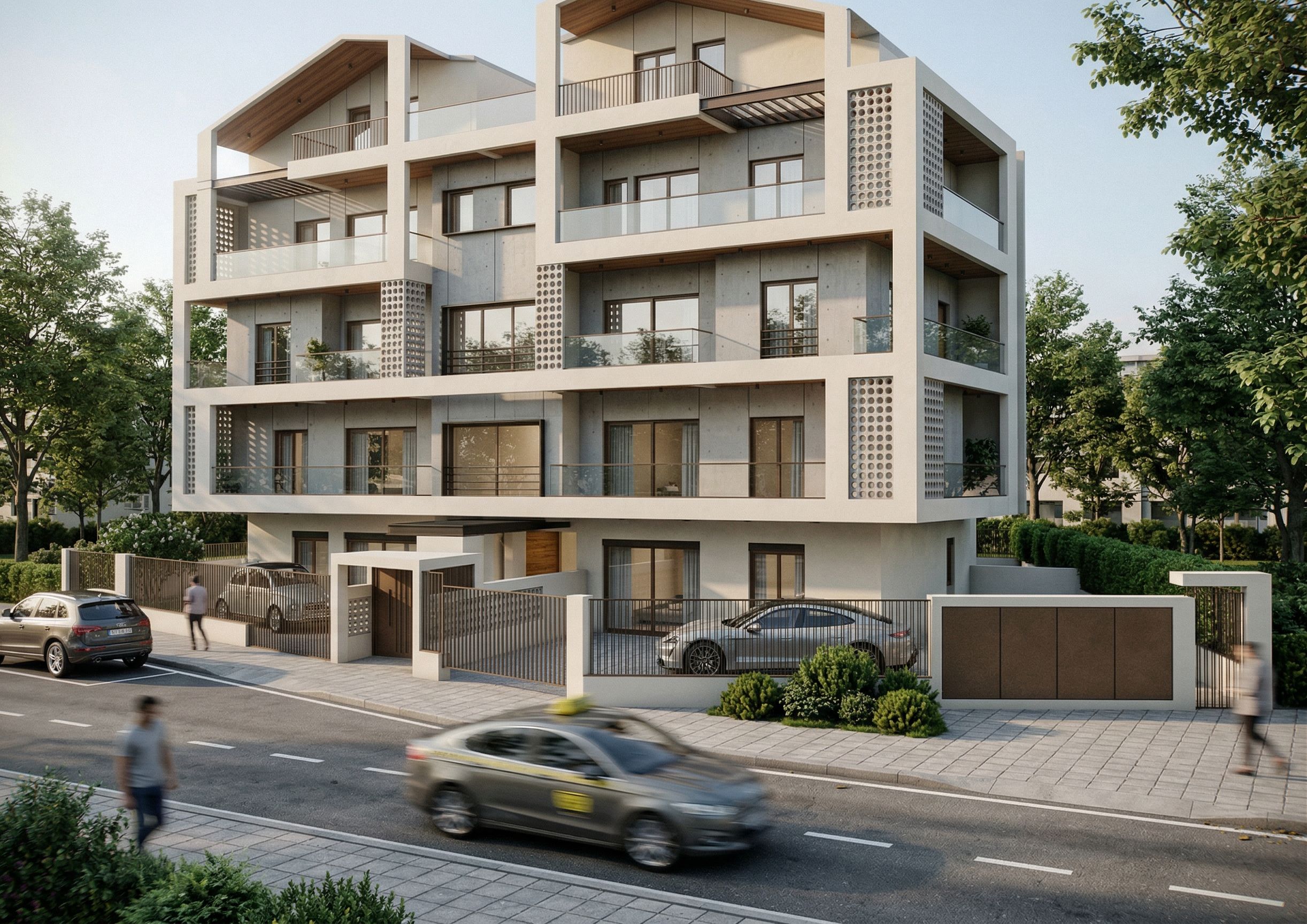 PromptModern block with large bronze windows, materials such as concrete,vanilla plaster,metal, Cement Breeze Blocks surrounded with greenery. Put at the left side in front of the left window a car . Also put at the left side of the building a car. Put at the right side in front of the big window a car and add besides this car a few bushes. Put in front of our building a road with a car., keep exact camera angle