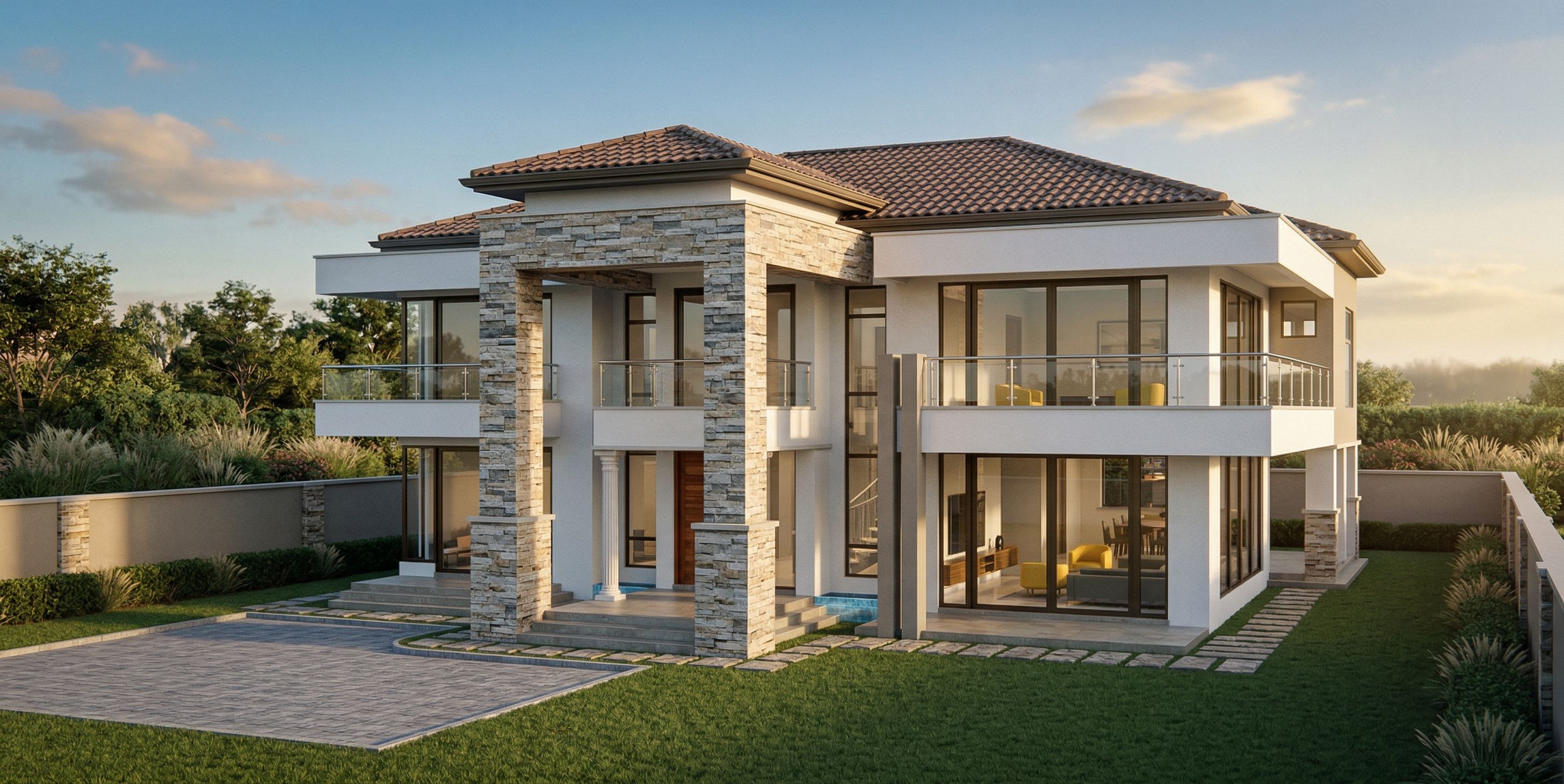 PromptPhoto of a modern residential building featuring expansive glass walls and elegant stone detailing. The design incorporates sleek columns and a prominent roofline. Surrounding the structure is a lush green lawn. The scene is illuminated by soft afternoon sunlight, casting gentle shadows across the facade. A low-angle perspective highlights the building's striking features, while a wide-angle view captures the impressive scale and surrounding environment, emphasizing the harmonious balance between nature and architecture. No opening on the perimeter wall, keep exact camera angle