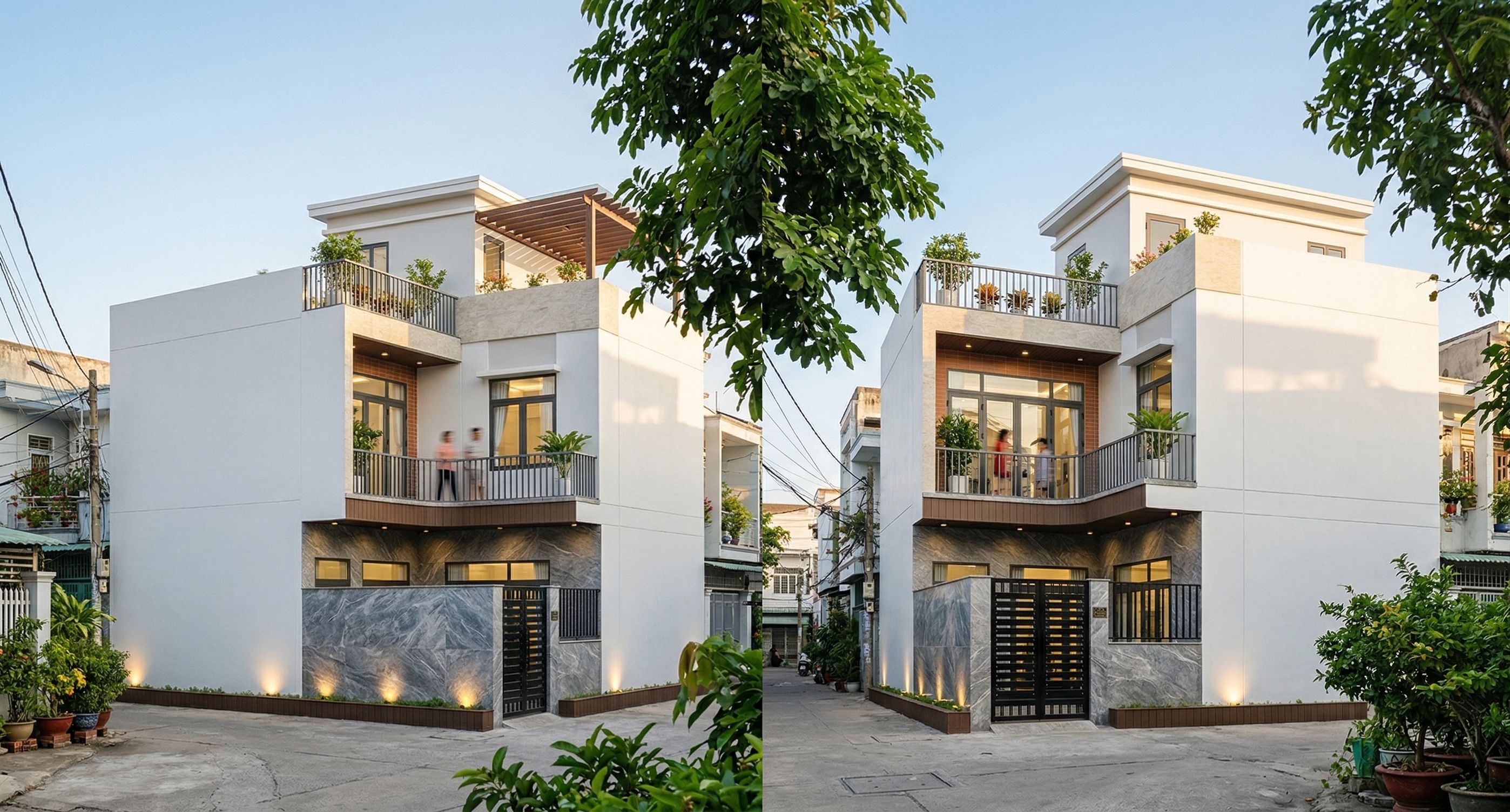 This photograph captures a modern three-story building with large glass windows and gray iron railings, further enhanced by potted plants on each floor's balcony. The lower roof is clad in dark brown wood-plastic composite. The clean lines, smooth white facade, and the contrast between the cream-gray natural stone on the balcony railings and the black painted iron railings are emphasized. Light from the glass windows shines in from within, creating surreal reflections of the surrounding environment. The entire first floor is clad in gray natural stone with veins, highlighted by the light shining from below. Small potted plants and people are placed on each floor's balcony to add vibrancy. The lower part of the balconies is clad in wood-plastic composite. Located in a small alley of a densely populated residential area with neighboring buildings, the building still maintains a sense of spaciousness. Warm afternoon sunlight casts soft shadows on the walls and pergolas. The overall design structure remains unchanged, clearly showing the brown tile cladding at the entrance to the second-floor balcony. Using a low-angle shot, preserving the existing perspective, and employing a wide-angle lens will highlight the height and scale of the building, adding depth to the scene. Maintain the correct camera angle., keep exact camera angle