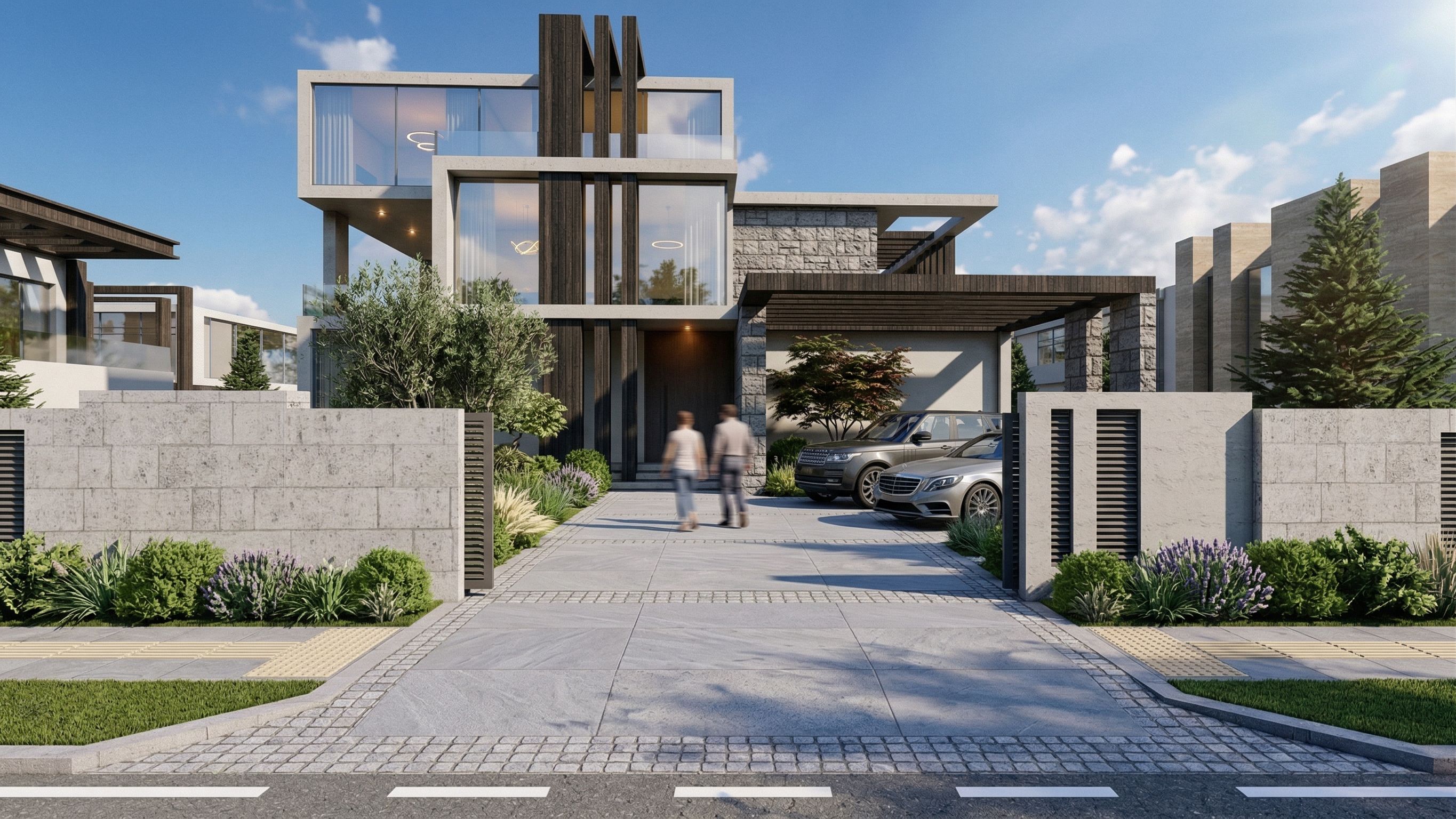 Ultra-realistic rendering of the front facade of a modern villa, with a beautifully landscaped driveway leading to the villa’s entrance. Include a smooth, elegant driveway made of high-quality concrete or stone tiles with subtle texture, blending into the surroundings. Add parked cars along the driveway for a more realistic scene, featuring sleek luxury vehicles such as a modern sedan or SUV, carefully placed in a natural position. Surround the driveway with well-maintained greenery, such as low shrubs, decorative plants, and trees that frame the entrance. Ensure the lighting is natural, with soft shadows casting across the driveway and reflecting off the villa’s glass surfaces. The villa’s facade should be highlighted with sharp details, focusing on the textures of the stone, glass, and wood elements. Add realistic road markings and pavement for a complete touch, with gentle reflections and soft ambient lighting that creates an inviting and upscale atmosphere, keep exact camera angle