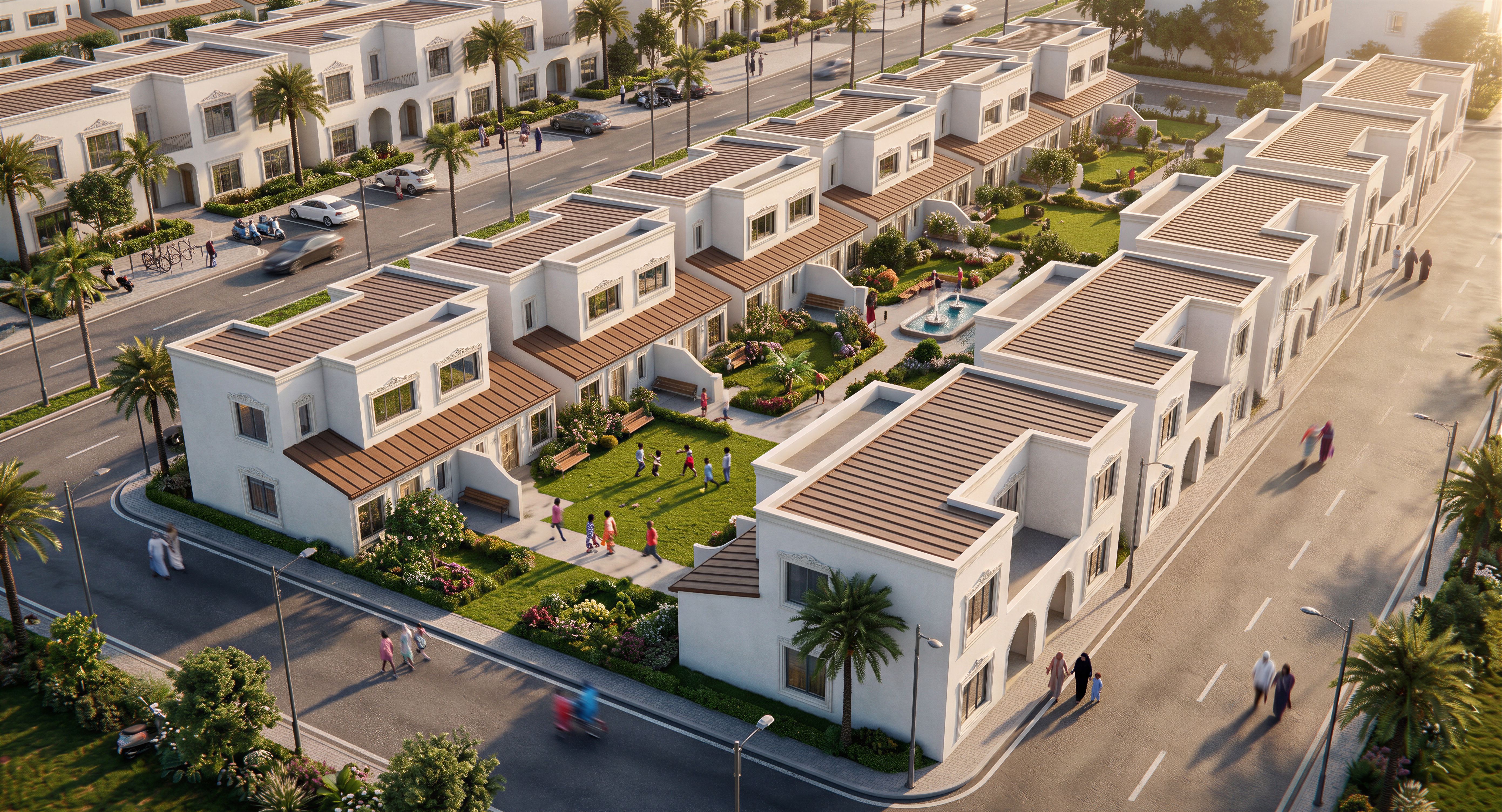 EnhancedPromptIMAGE OF UNITS WITH A MIDDLE GREEN COURT WITH LANDSCAPING. USE MOULDINGS AROUND OPENINGS AND WINDOWS. MAKE GLASS REFLECTIVE AND REALISTIC. INCLUDE PEOPLE AND CHILDREN OF SOMALI ORIGIN IN THE IMAGE. USE WHITE WALL MASTER ON THE BUILDING. INCLUDE SOME STREET LIGHTS. USE PALM TREES IN THE DESIGN. MAINTAIN THE DECRA LEAN TO ROOF COVER IN THE ORIGINAL DESIGN. MAKE IMAGE HIGH RESOLUTION 8K., keep exact camera angle