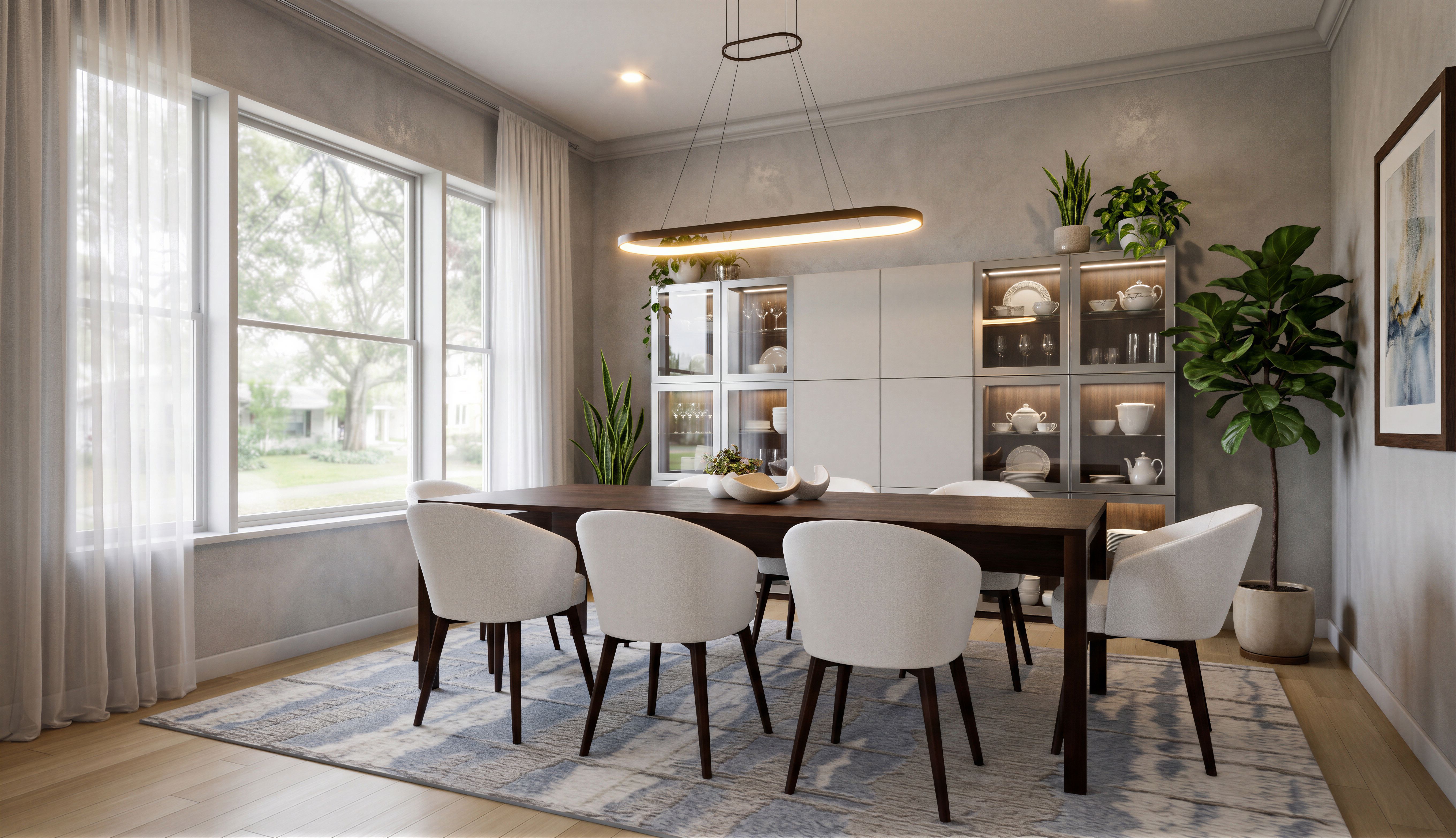 EnhancedPromptMake photorealistic renderings of the dining room Light fixtures on, bright room; China cabinets on the back wall; Some interior plants; Picture on the right wall; Transparent curtains to the floor at the window; Use the image from the Reference Image 1 as a background seeing through the window, blur and washed out the view slightly; , keep exact camera angle