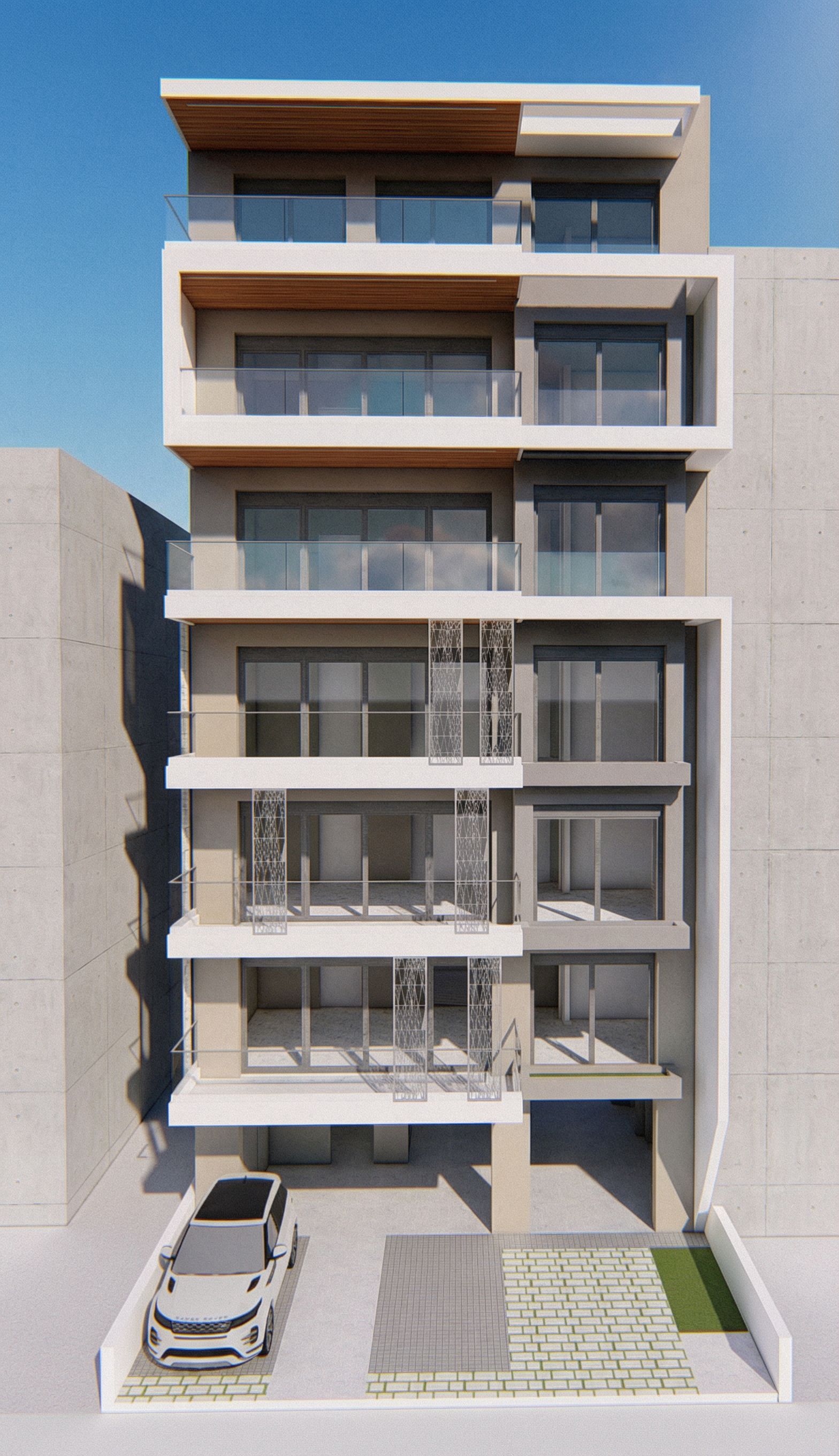 PromptPhoto of a modern apartment building featuring sleek lines and contemporary balconies. Emphasize , expansive glass windows, and wooden tops of balcony accents. Capture natural sunlight enhancing the architectural details, with soft shadows cast by the balconies. Basic color ral 7006 and some beige details with white balconies. Dont change the building. No trees .Do light grey the right and left box, keep exact camera angle