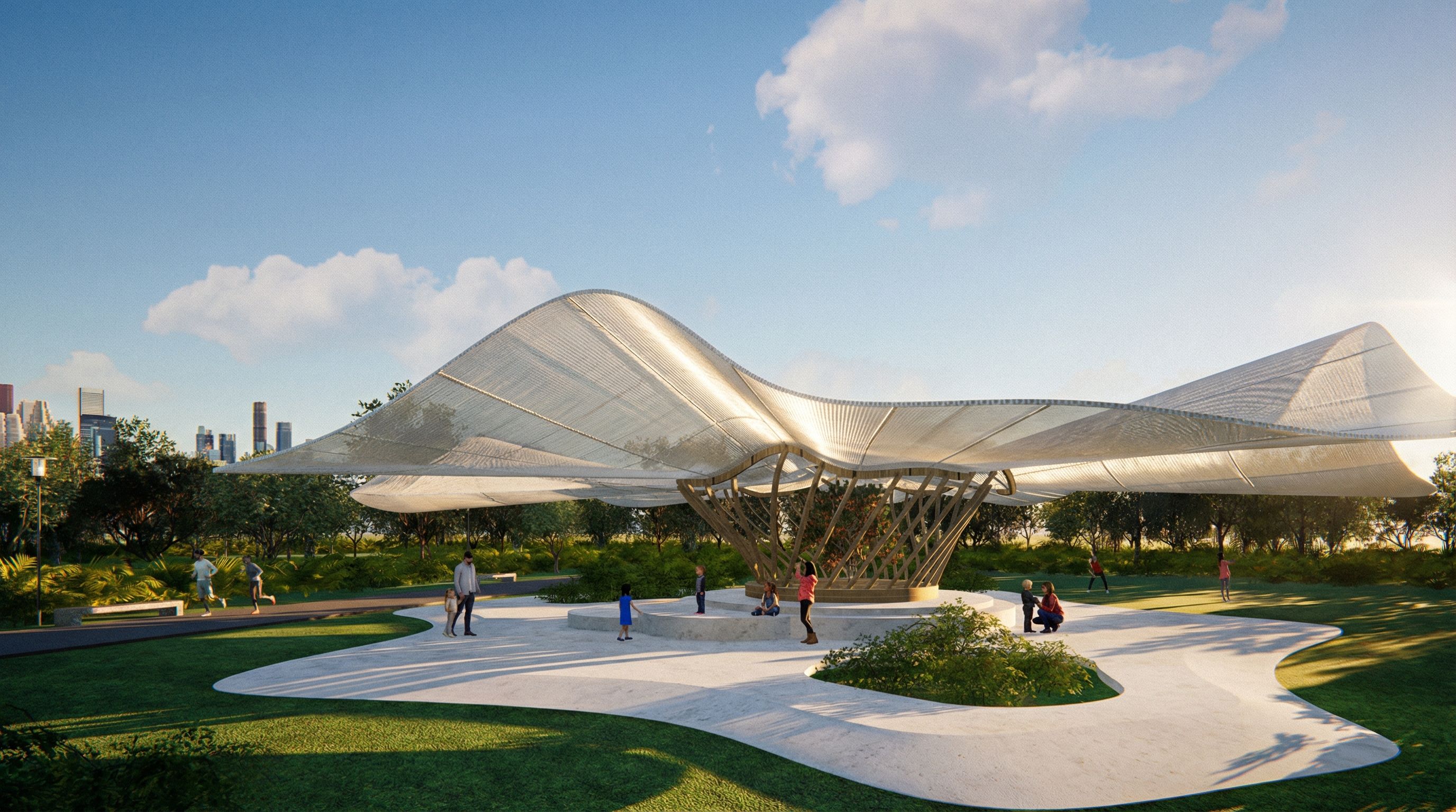 PromptThis is a pavilion in the middle of a park. Make the materials look a bit more realistic., keep exact camera angle