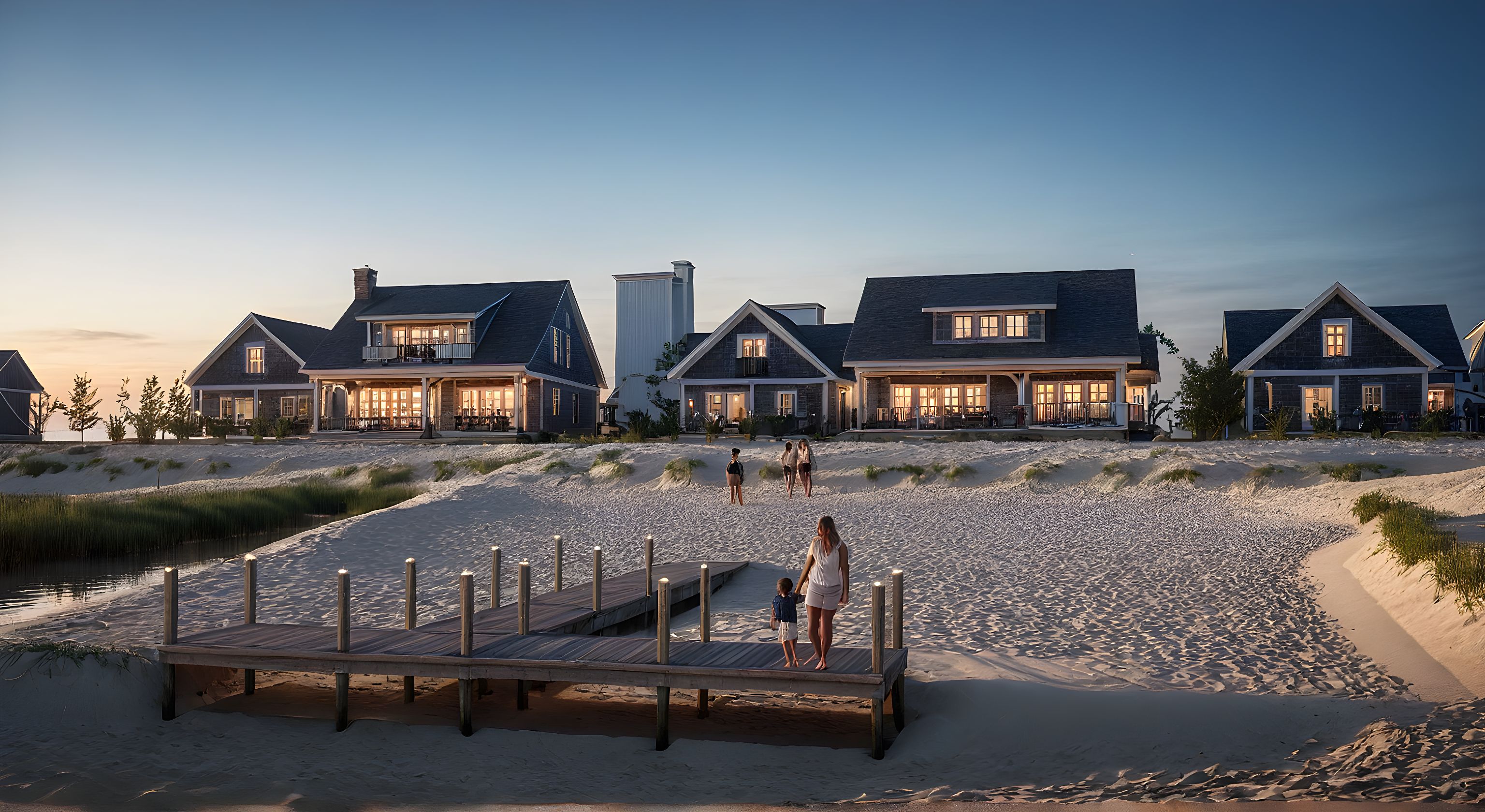 Photo of a waterfront residential complex featuring charming nantucket style cottages with pitched roofs and stone accents, surrounded by sand and water in the foreground. Dusk Shot with light in windows