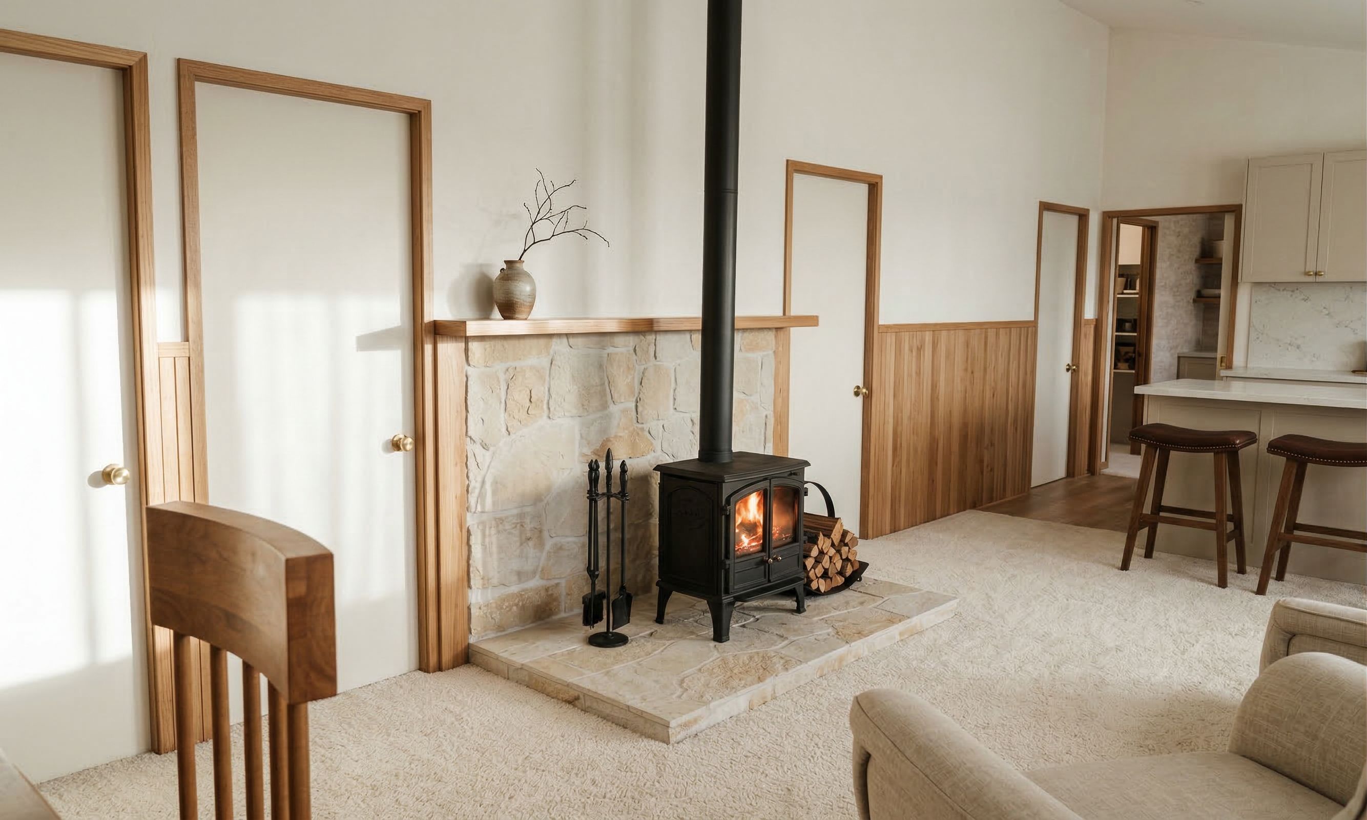 keep colours and materials, ivory carpet on floor, light stones around wood stove, keep exact camera angle