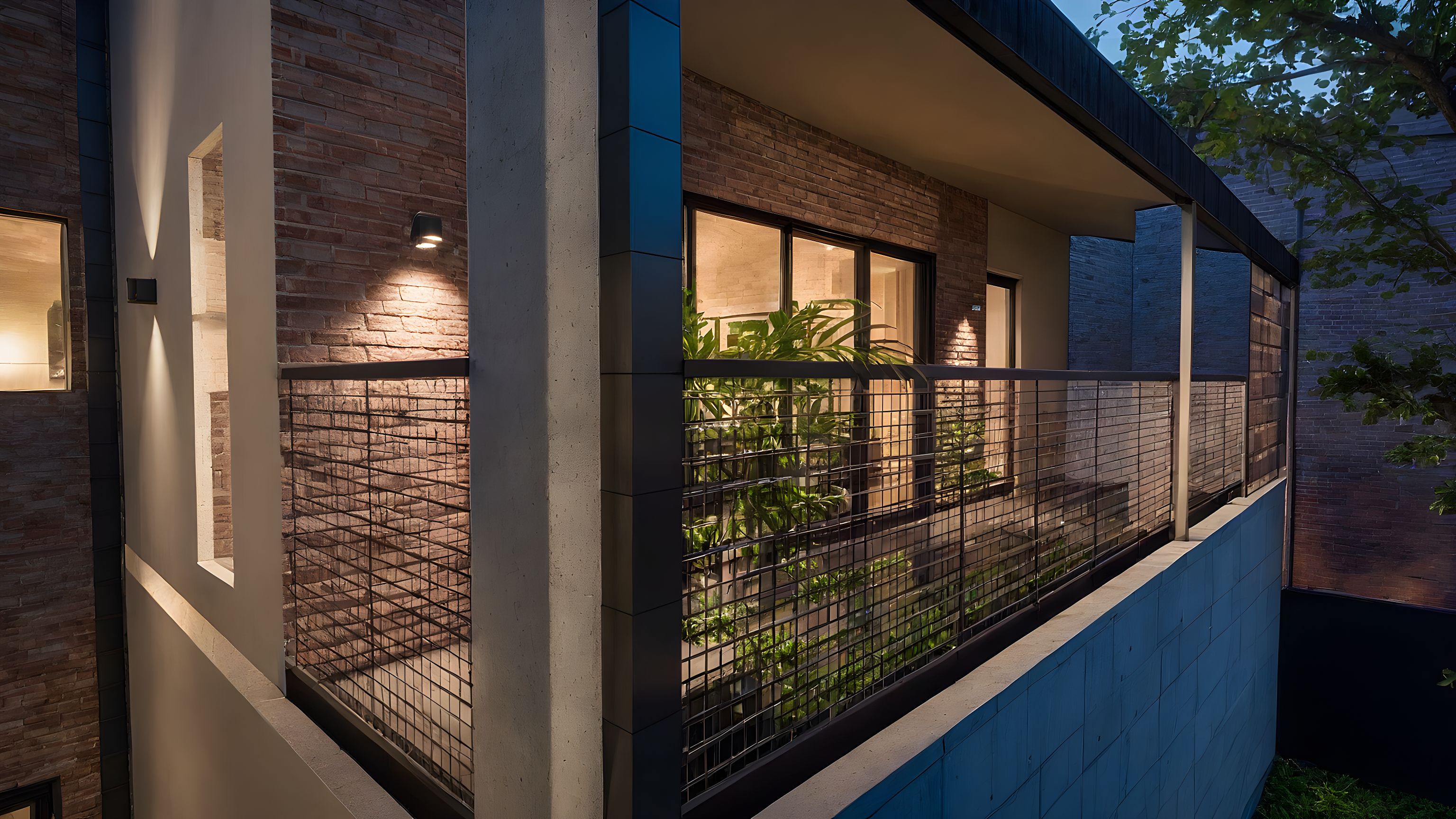 Photo of a modern residential balcony with rustic brick accents and sleek metal railings. The textured brick walls contrast with smooth concrete surfaces, while large glass windows invite natural light. Lush greenery adds a touch of nature. Soft artificial lighting enhances architectural features, creating gentle shadows. Captured from a slightly elevated angle, the perspective frames the balcony against a backdrop of adjacent structures and foliage, with a clear blue sky visible, emphasizing the urban setting and providing a sense of depth in the composition.
