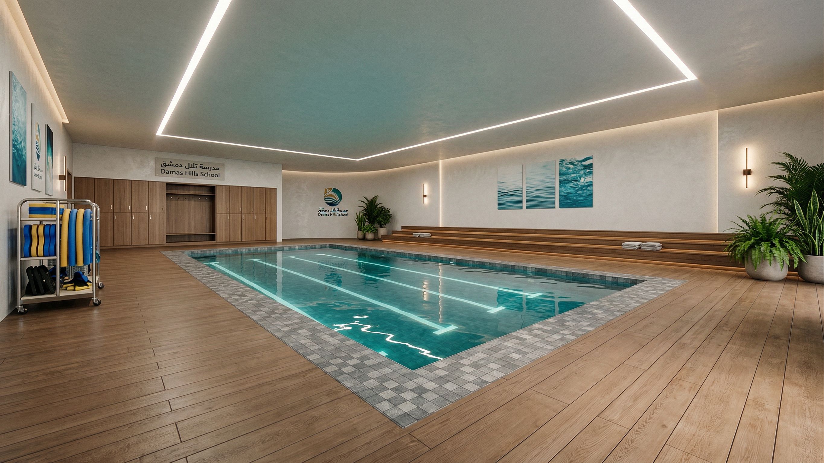 Promptthis is a scene of a educational swimming pool in Syrian high school (Damas Hills School مدرسة تلال دمشق)for student .. do simple interior and enhance the materials and make it super realistic and add swimming learning equipment add closets and make the pool larger, keep exact camera angle