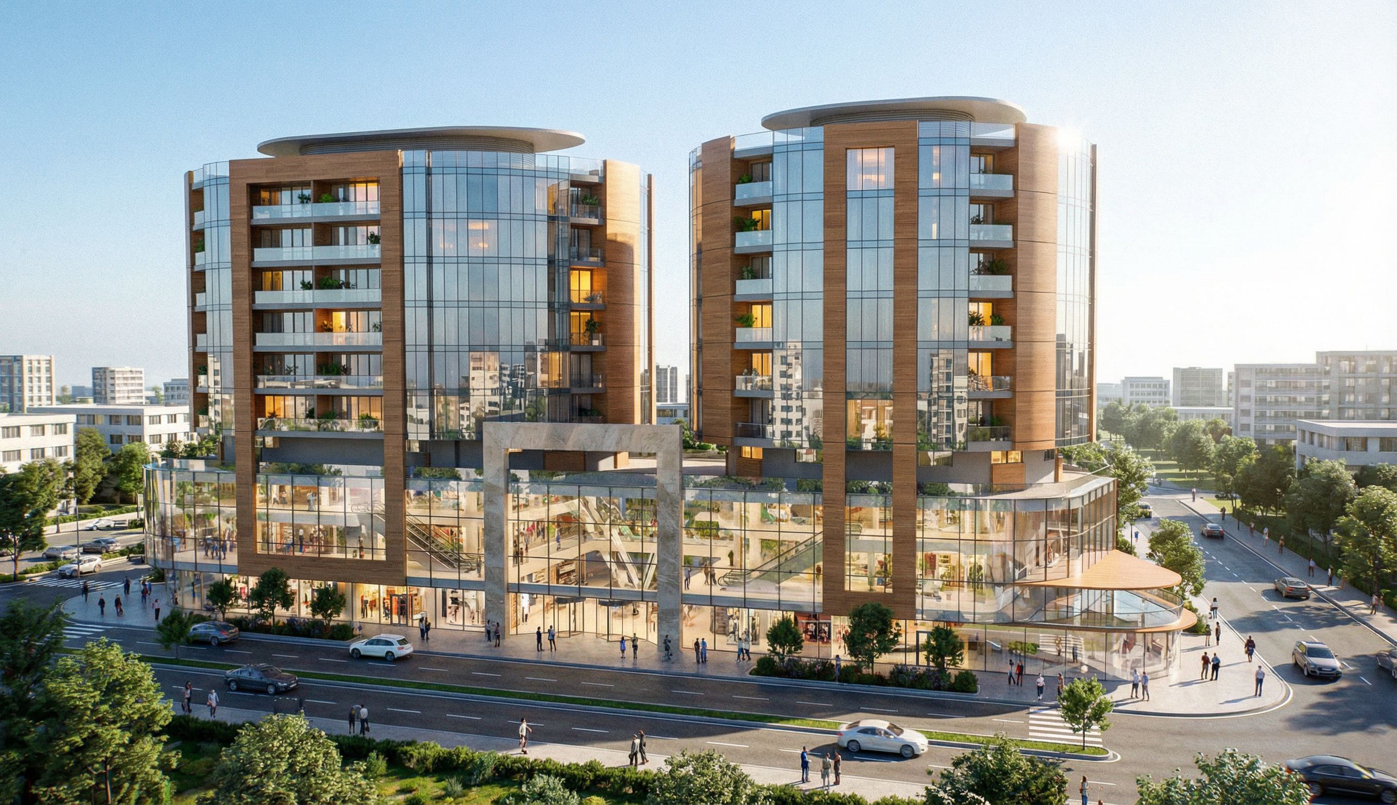 THIS IS A TWO RESIDENTIAL BUILDINGS ON A PODIUM WHICH IS A 4 STORIES MALL COMMERCIAL CENTER MAKE THIS BUILDING SUPER REAL AND ALIVE THE RESIDENTIAL TOWERS MUST LOOK ALIVE AND THE MALL MUST LOOK ICONIC THE TWO BUILDINGD MUST BE CLADDED WITH GLASS AND WOOD PANELS DON'T you ever Change THE SCALE OF THE BUILDING DON'T CHANGE THE CAMERA ANGLE OR THE FRAME OF IT DON'T CHANGE ARCHITECTURE MAKE THE MALL CLADDED IN GLASS CHOOSE MATERIALS THAT CAN MAKE THE BUILDING LOOK LIGHTER IN WHEIGHT KEEP THE CAMERA ANGLE FIXED KEEP THE SAME NUMBER OF STORIES 4 LEVELS FOR A MALL AND 10 FOR THE RESIDENTIAL THE ENTIRE BUILDING ESPECIALLY THE ROOF MUST BE APPEARD DON'T CHANGE THE CAMERA ANGLE keep exact camera angle, keep exact camera angle