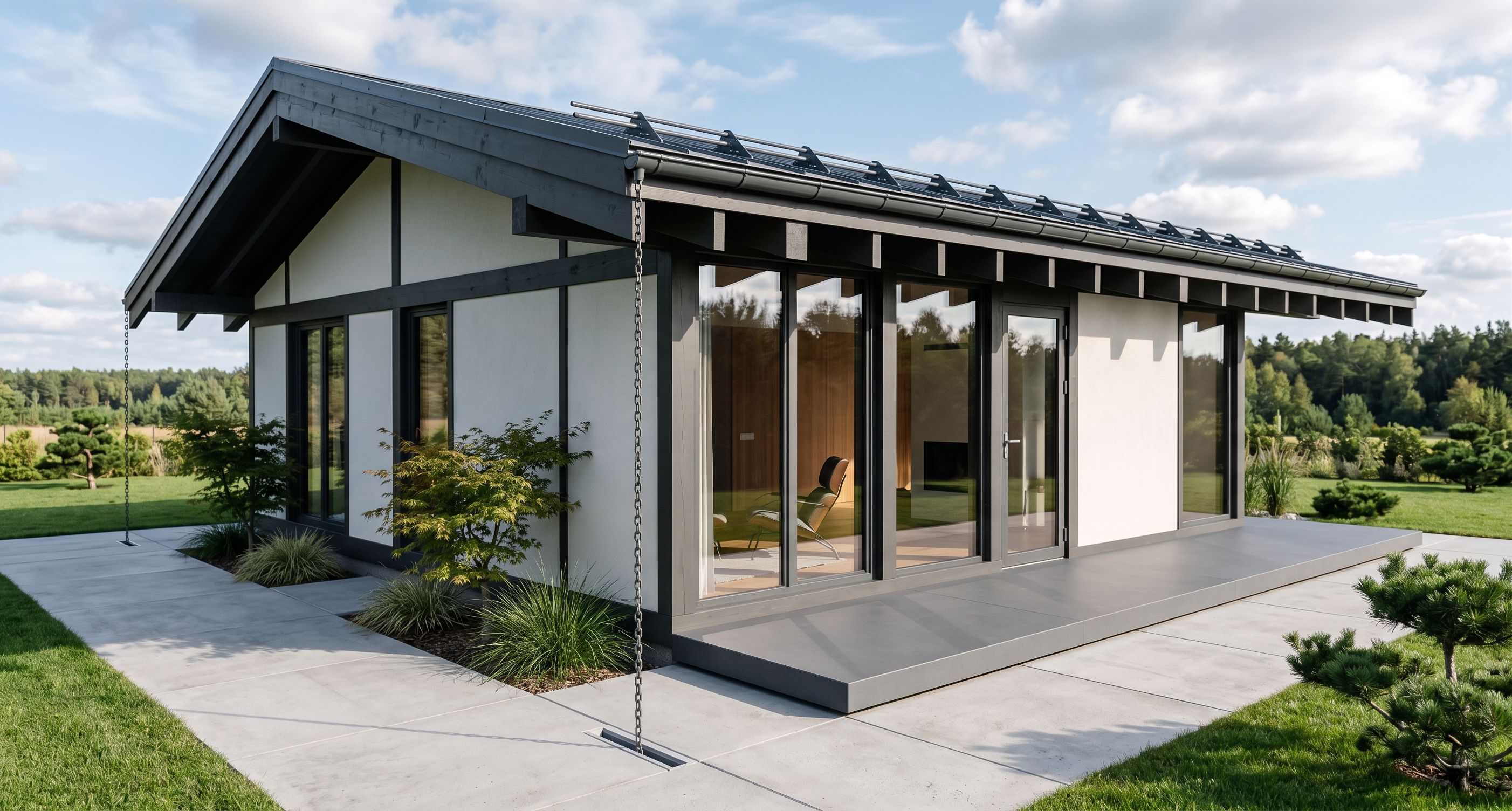 Современный одноэтажный загородный дом в стиле минимализм с элементами скандинавской и японской архитектуры, двускатная крыша, широкие свесы, тёмные графитовые балки. Фасад с ритмом вертикальных и горизонтальных элементов и светлыми панелями. Терраса если попадает в кадр выполнена в цвете серый графит и находится на уровне участка, без видимых свай. Окружение — крупноформатная бетонная плитка, переходящая в ухоженный газон. Минималистичные кусты и зелень. Цепь водостока уходит в скрытый слив в плитке, без камней и декоративных кругов. Без автомобиля. Освещение — тёплый мягкий свет golden hour, длинные тени, реалистичная визуализация. Камера: противоположный угол, спокойная архитектурная подача, объектив 35mm, без искажений., keep exact camera angle