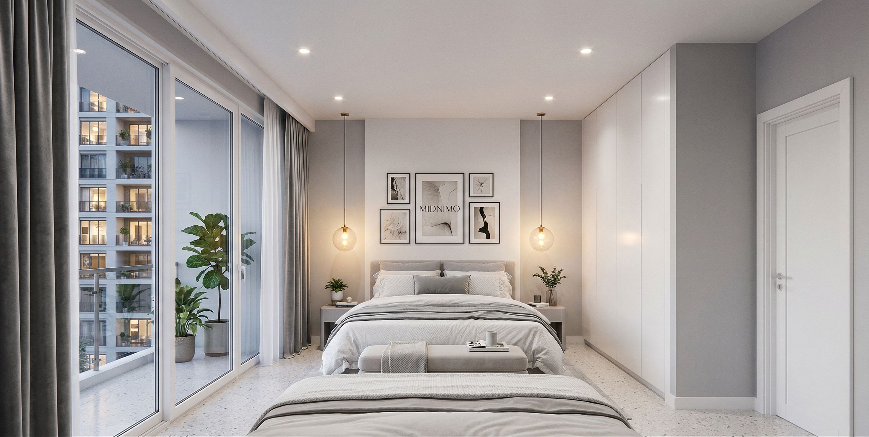 INTERIOR OF A HIGH END HOUSE SHOWING A COMFORTABLE BED WITH WHITE AND GREY UPHOLSTERY. HAVE SIMPLE GYPSUM CEILING WITH SPOT LIGHTS. MAKE INTERIOR HIGH END PASTEL COLOUR. TURN ON THE LIGHTS IN THE ROOM. HAVE THE NAME MIDNIMO IN ONE OF THE ART WORK ABOVE THE BED. MAKE RESOLUTION HIGH AND PHOTOREALISTIC 8K. INTRODUCE A CURTAIN IN THE WINDOW HAVE A CLEAR SLIDING DOORS BEHIND THE CURTAIN. MAKE THE WALL PAINT A MIX OF WHITE AND PASTEL GREY. MAKE THE CURTAIN RAIL IN THE BEDROOM WINDOW BE CONCEALED IN THE GYPSUM AND BE WHITE. HAVE THE SUSPENDED LIGHTS ON EITHER SIDES OF THE BED BE OF CLEAR ROUND BALLS AND HAVE WARM LIGHTS. THE IMAGE OUTDOOR THROUGH THE WINDOWS SHOULD SHOW UPPER LEVELS OF A RESIDENTIAL .APARTMENT. MAKE THE DOORS AND DOOR FRAMES WHITE AND SAME LEVEL. MAKE THE WARDROBE WHITE AND SAME HEIGHT AS CURTAIN BOX. REMOVE THE WALL BRACKETS.MAKE WARDROBE BE SAME HEIGHT AS SLIDING DOOR. MAKE CRTAIN BE ELEGANT GREY WITH WHITE SHEARS. MAKE THE ROOM ELEGANT WITH USE OF WHITE AND PASTEL GREY ON THE WALLS. remove the columns and stairs and couch in the foreground and maintain original location of bed. MAINTAIN ORIGINAL CAMERA ANGLE AND POSITION OF EVERYTHING IN THE ORIGINAL IMAGE., keep exact camera angle