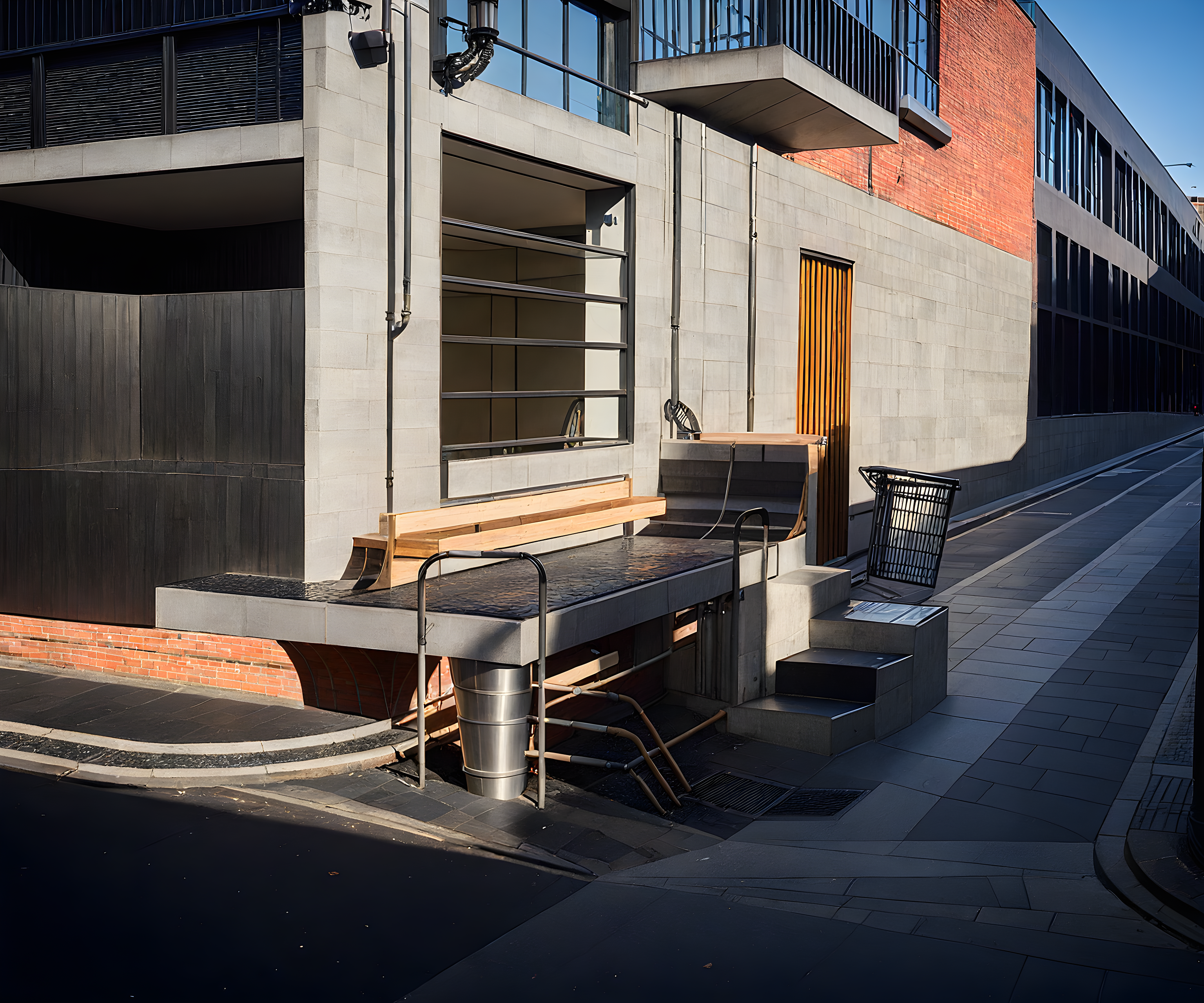 Promptsmall scale intervention of a chair integrated into the side of a Melbourne CBD laneway to match the surrounding context, there is a gap under the chair that is mounded to the building facarde for a homless person sleep, there is pipes acting as a ladder and handrail and rough, rocky stairs, there are also curves elements forming a modern connection to the brick building with bluestone pavement and road