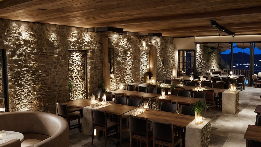 Interior of a restaurant with creek style. the restaurant is cave like. walls are white wit stone floors. Scene is at night