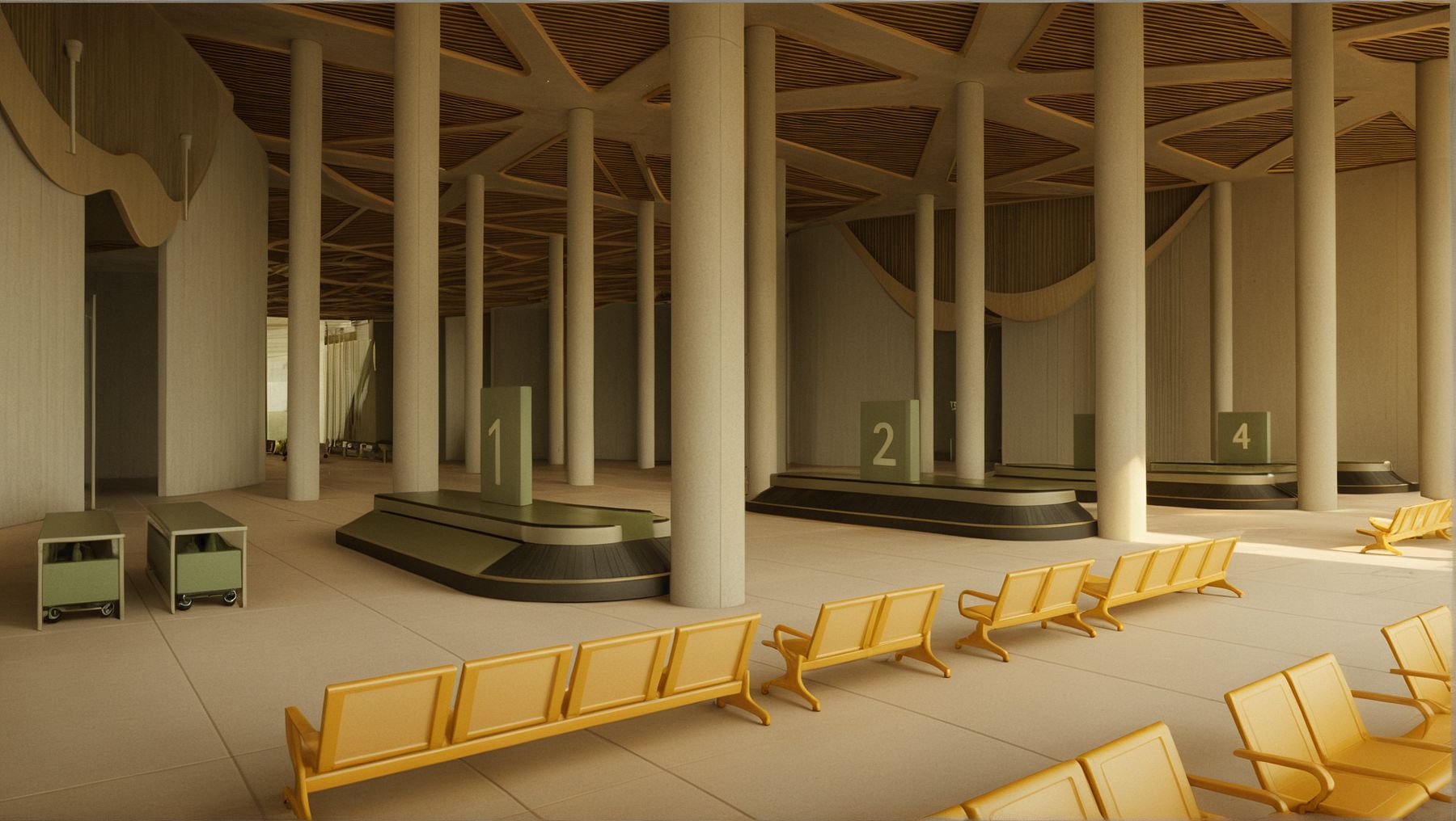 Promptstyle transform, interior perspective shot, modern arrival airport terminal , baggage claim area with baggage belts , baggage trolleys, high ceiling, 3d acoustic concrete with metal panels ceiling, round concrete columns, curved wall with wood strips design, waiting area, 60% olives greens 30% soft whites 10% soft yellows color palette, afternoon mode, soft interior lighting, high quality materials textures, realistic render