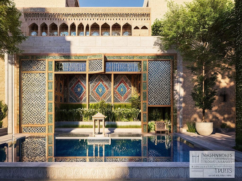 PromptCreate a highly detailed 3D render of Nasiroldouleh Mansion, a Qajar-era traditional Persian house in Tehran. The floor plan includes a central courtyard with a diamond-shaped stone pool, a mirror room (approx. 12×3.7 m) on the north side, three-panel wooden sash windows with colorful stained glass, a porch with plastered columns, brick walls with gypsum decorations, arched ceilings (khancheh vaults) in the basement, and carved wooden ceilings. Render it in a warm golden sunset light, using realistic textures — brick, gypsum, colored glass reflections — and a traditional Persian architectural mood. Viewpoint: from the courtyard toward the mirror room, focusing on the reflections, symmetry, and calm historic atmosphere