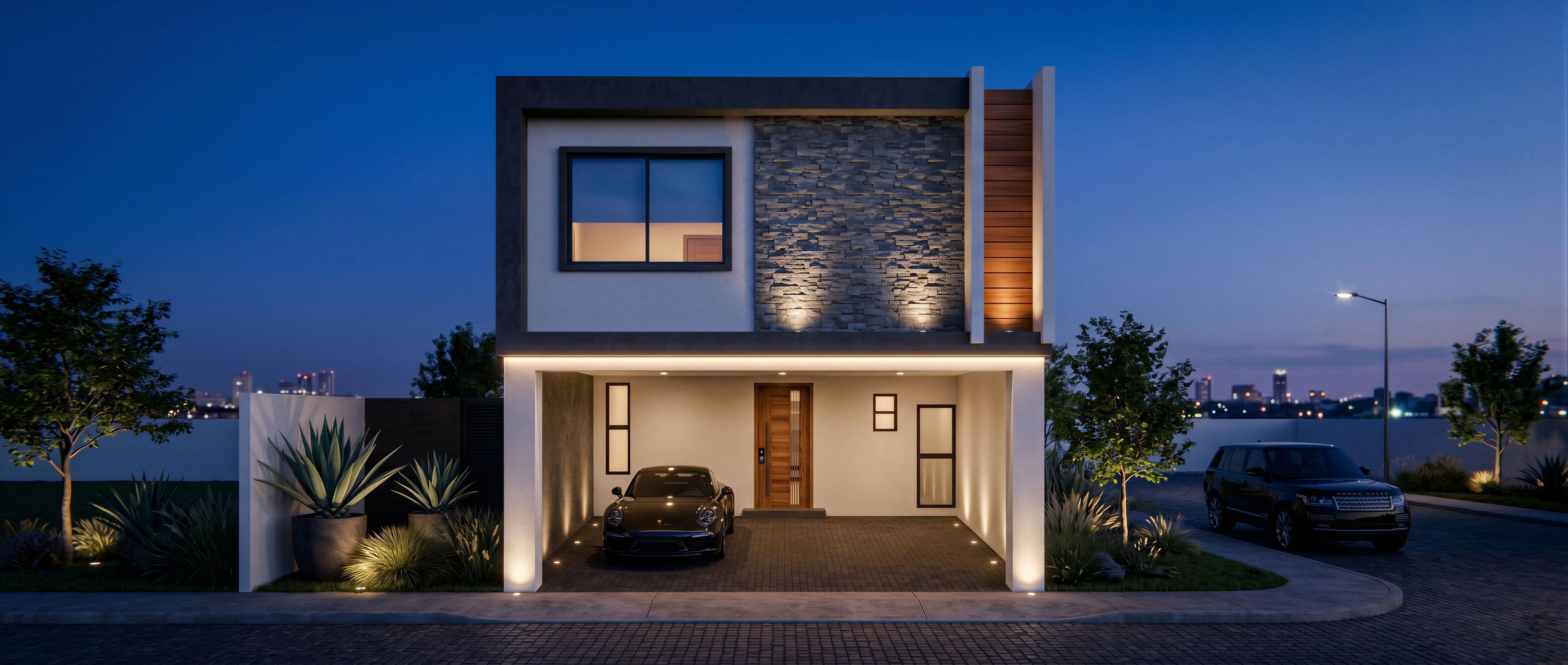 Photo of a modern two-story residential building, showing an elegant facade with a mix of stone cladding texture and smooth white walls. Highlight the large windows to let in natural light, in an urban context of subtle vegetation. The scene captures the bright light of day, creating soft shadows and vibrant highlights. Viewed from a slightly elevated angle to emphasize height and design features, using a wide-angle lens for a wide perspective. Maintain the exact camera angle. improving the quality of the materials and adding lights to the facade add a car to the garage, keep exact camera angle