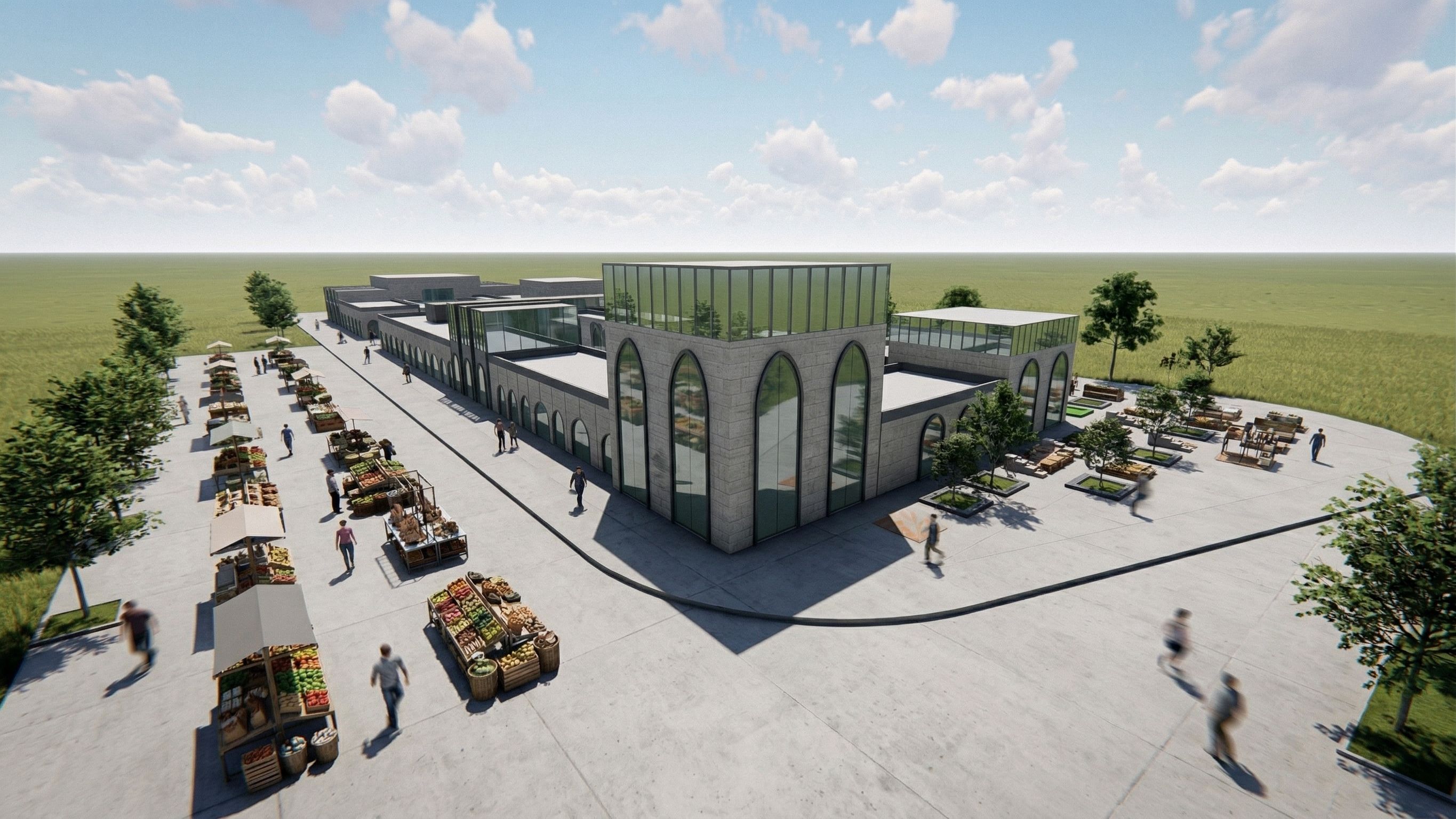 Ultra-realistic architectural render of the provided commercial marketplace design, preserving the exact geometry and layout without any modifications.