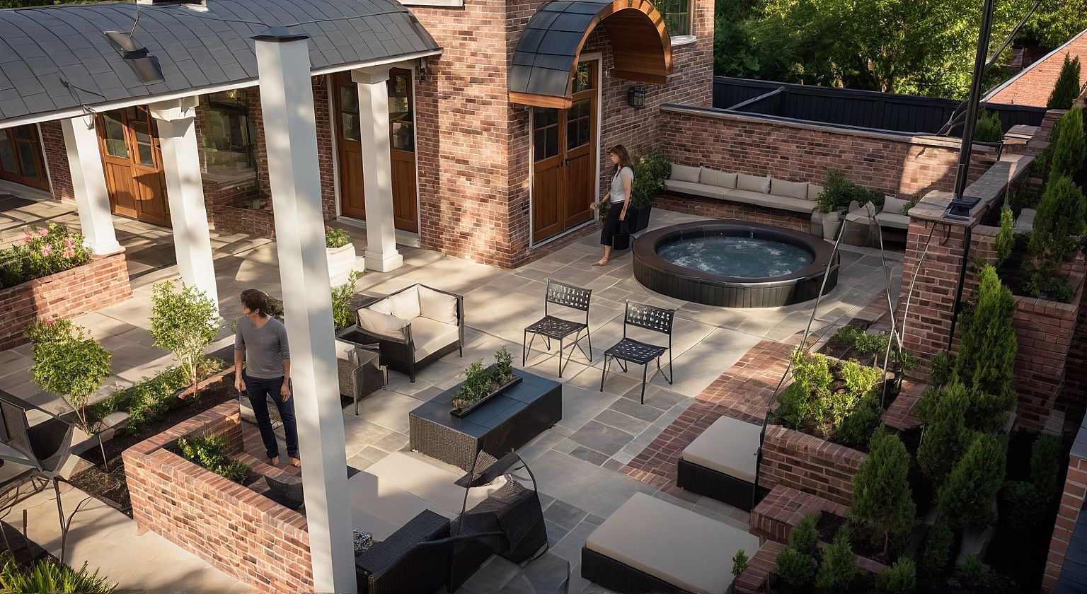 Photo of a cozy residential courtyard with a brick exterior house as the focal point, showcasing intricate architectural detailing such as arched doorways and elegant wooden doors. The setting includes a well-arranged outdoor lounge area with modern furniture and a circular hot tub, surrounded by manicured greenery and flowering plants. Soft afternoon light casts gentle shadows, enhancing textures. Captured from a slightly elevated angle to provide a wide view of the space, using a standard lens to retain realistic proportions, emphasizing an inviting, lived-in atmosphere. Roof should be green shingles