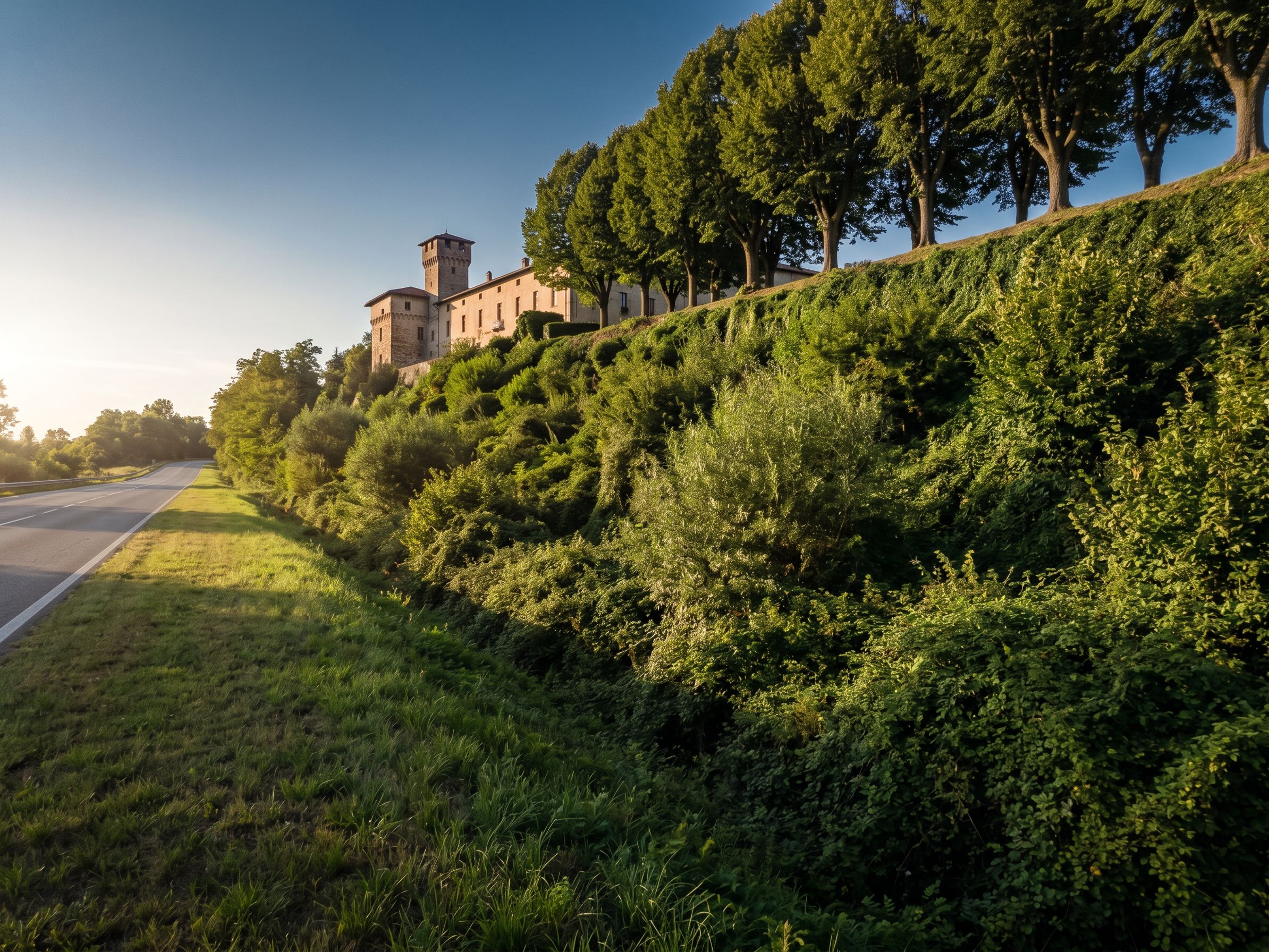 PromptCambiamento del panorama della ripa con sfondo il castello di Malgrà in reference: - parte alta viale di Olmi - versante manto verde di arbusti di vegetazione perifluviale autoctona ( piemonte ) , keep exact camera angle