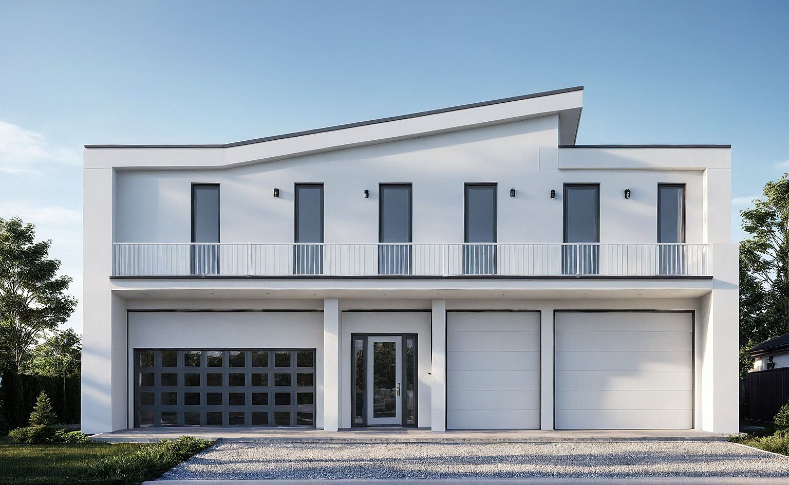 Promptmodern, white exterior, top level is window, window, door, window, door, window. Bottom is garage, door with side lights, then open to back, 5 supporting beams