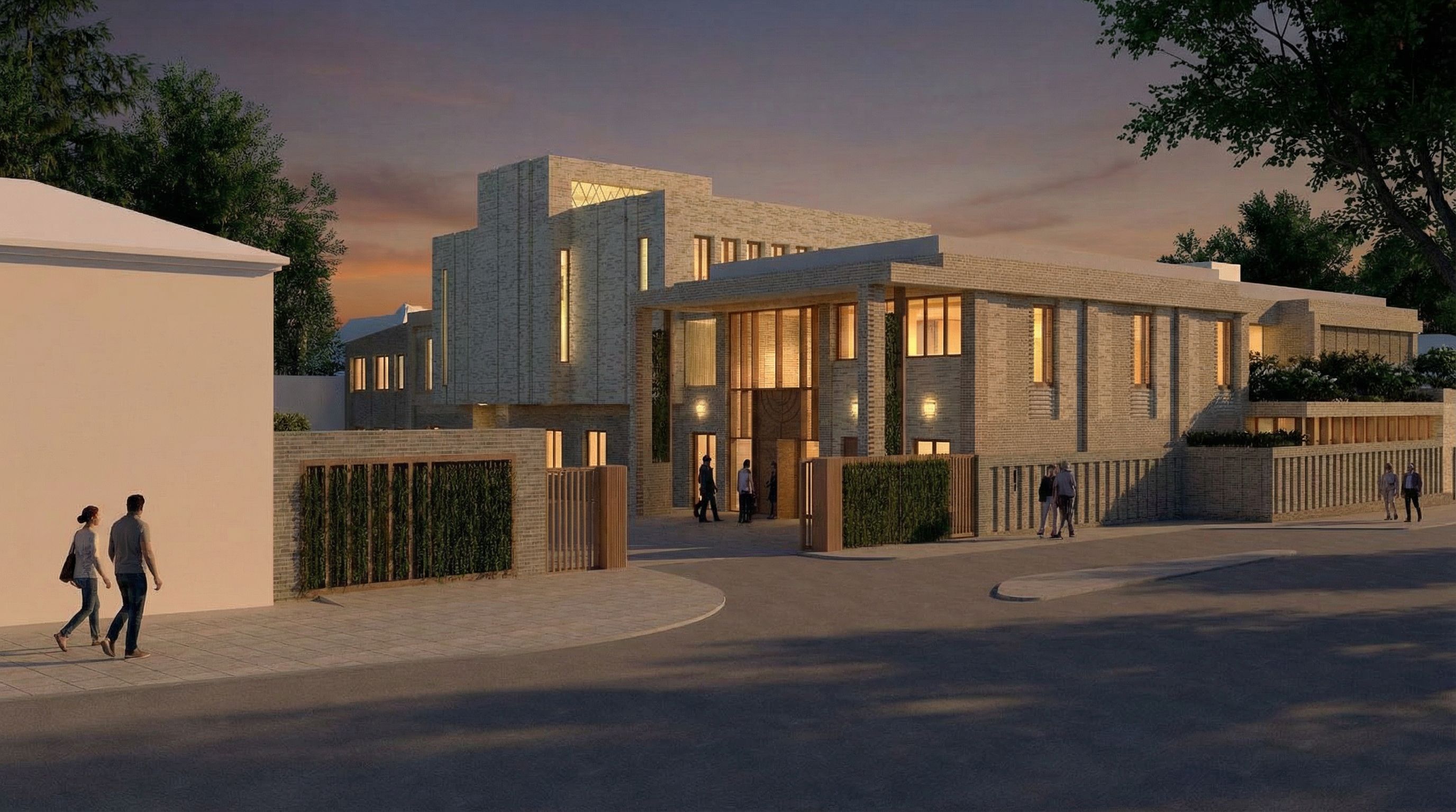 architectural exterior rendering, render this photo into photorealistic rendering, keep format of image. render of synagogue. keep lighting of uploaded image, wide establishing shot, dusk atmosphere with soft lighting, including people, high quality, professional, detailed scene