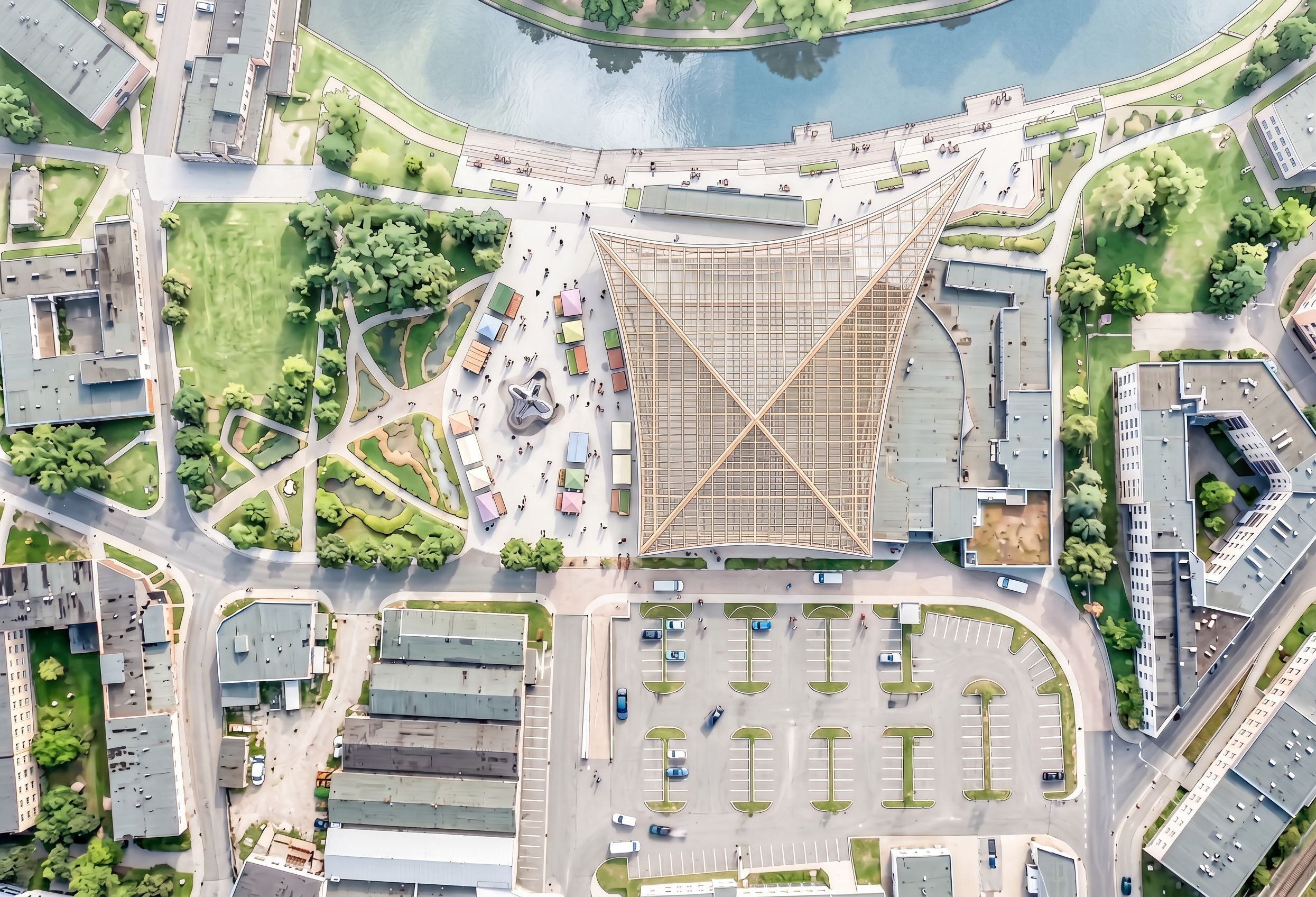 PromptEdit the provided site plan. Keep all buildings, geometry, layout, and overall composition exactly as they are. Do not modify the form or position of the main building or surrounding structures. Remove ALL text labels, annotations, arrows, and descriptions. Adjust the water feature: instead of a continuous river strip, create a bay (zátoka) centered at the top of the site. The water should be localized only in this central recessed area. On both the left and right sides of this bay (top left and top right), replace the water with park landscape (greenery, paths), so the water is only in the middle and land continues on both sides. Keep the connection to the waterfront logical and integrated with the surrounding public space. Modify the service (delivery) access: create a horizontal delivery route running along the bottom edge of the main building, directly adjacent to its rear façade, connected to the road. Keep the employee parking below and clearly connect it with paths and access roads. Indicate the roof structure above the building as a wooden beam system — subtly suggest a grid or pattern of timber beams in the roof area (top view), without changing the building shape. This should read as a light structural texture, not a solid fill. Maintain all landscape areas (park, marketplace, promenade) and ensure clean, logical connections. Style: clean architectural site plan, minimal, precise linework, soft colors, no text. , keep exact camera angle