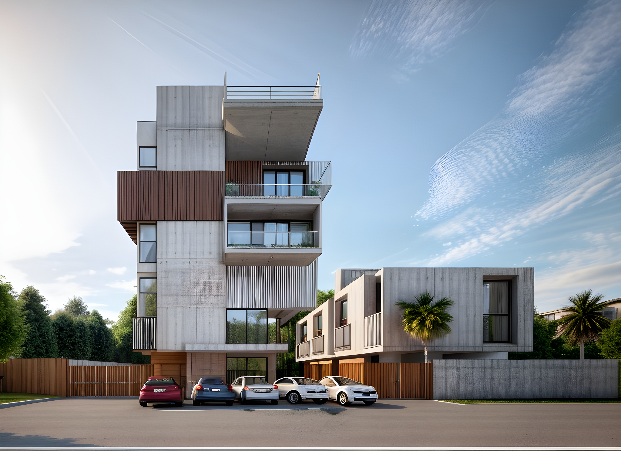 Promptphoto realistic image of apartment, with board formed concrete walls, external white walls (especially on the smaller buildings to the right, with wooden slats on the main facade, glass with soft interior lighting, wooden entry gate, with lush greenery within neighbourhood context