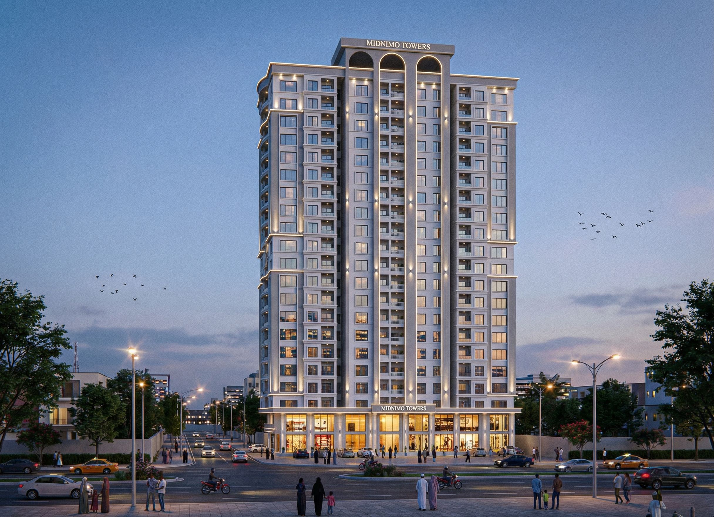 EXTERIOR IMAGE OF A BUILDING WITH GROUND FLOOR AND FIRST FLOOR AS COMMERCIAL FLOORS AND 2ND -20TH FLOORS APARTMENTS. MAKE THE GLASS REALISTIC, CLEAR AND REFLECTIVE. INCLUDE SOME SPOT LIGHTS AND ROPE LIGHTS, STREET LIGHTS IN THE BUILDING. INCLUDE SOME BIRDS IN THE SKY. INCLUDE SOME PEOPLE OF SOMALI ORIGIN IN THE IMAGE. USE WHITE AND PASTEL BROWN COLOUR ON THE BUILDING. PUT THE NAME " MIDNIMO TOWERS" ON THE BUILDING. INCLUDE MOULDINGS ON OPENINGS, WINDOWS AND ARCHES IN THE BUILDING. USE WHITE WALL MASTER AND PASTEL GREY ON THE BUILDING. REDUCE THE SIZE OF THE WRITING "MIDNIMO TOWERS" AND WRITE IT ALSO AT THE CURVED PART OF THE ROOF ON THE BUILDING FACADE. REPLACE THE BROWN WITH A LIGHTER PASTEL GREY COLOUR. MAINTAIN CAMERA ANGLE FROM ORIGINAL IMAGE., keep exact camera angle