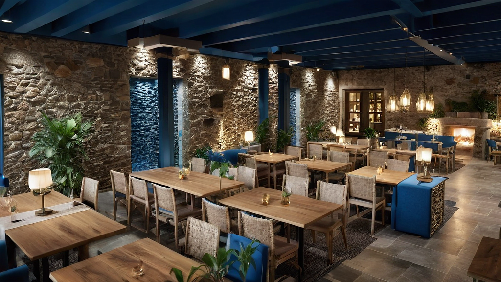PromptInterior of a restaurant with creek style in the evening. the restaurant colors are Greek and walls are stones and plants hang from the ceiling. Chairs are blues. Floors are stones
