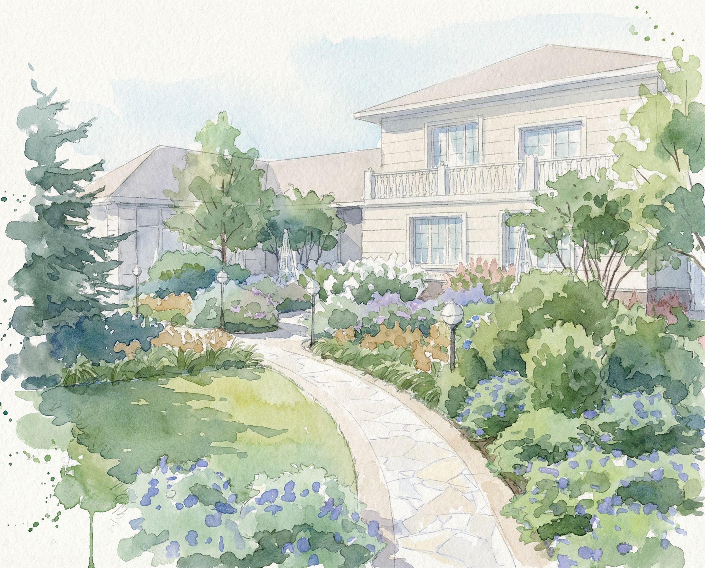 PromptConvert this landscape photo into a loose watercolor sketch. Light pencil underdrawing visible beneath translucent watercolor washes, wet-on-wet technique with colors bleeding softly into each other, white paper left unpainted for highlights, loose splashes and drips at edges, limited palette of greens, blues, earth tones. Quick, fresh, spontaneous feel. Landscape architecture presentation watercolor style. Maintain all elements and viewpoint., keep exact camera angle