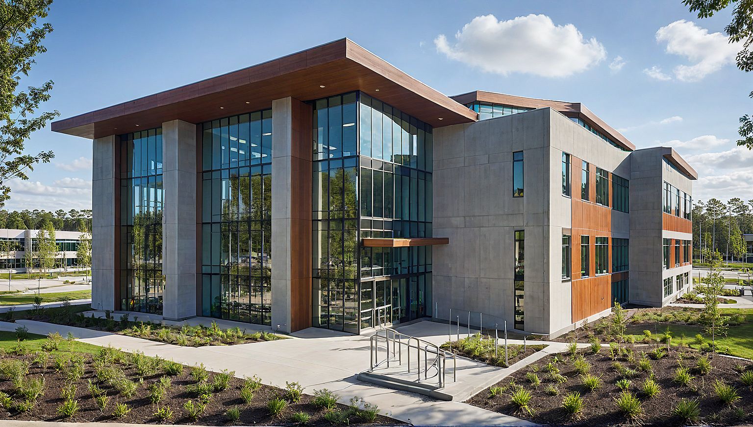 PromptPhoto of a modern School building featuring a combination of smooth concrete and warm colored steel concrete pillars in front as structural elements. Large glass windows dominate the façade, providing a sense of transparency and connection with the landscape. Set against a vibrant urban backdrop with greenery surrounding, the scene captures bright, natural daylight illuminating the structure, casting soft shadows. It includes students roaming the grounds in uniform. A low-angle perspective highlights the building’s unique roofline and entrance, evoking a welcoming atmosphere. The rendering should achieve lifelike qualities, emphasizing the sleek textures and harmonious integration with the environment. Include students and teachers outside the building.