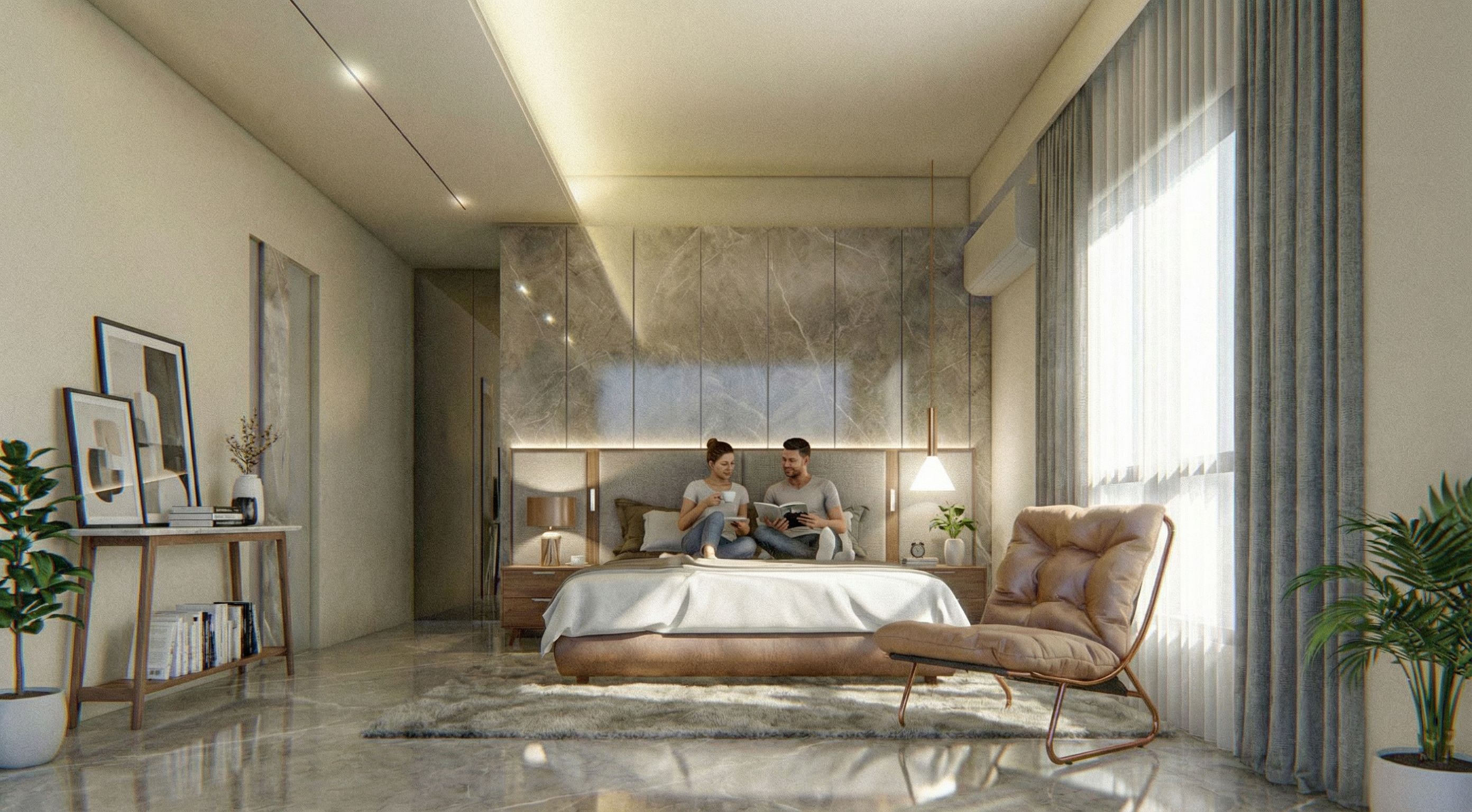 Promptconvert this bedroom into more modern hyperrealistic realistic interior of bedroom with ash colored marble floor and smart head panels along with realistic curtains and precise interior lighting and make everything like a realistic picture , keep exact camera angle