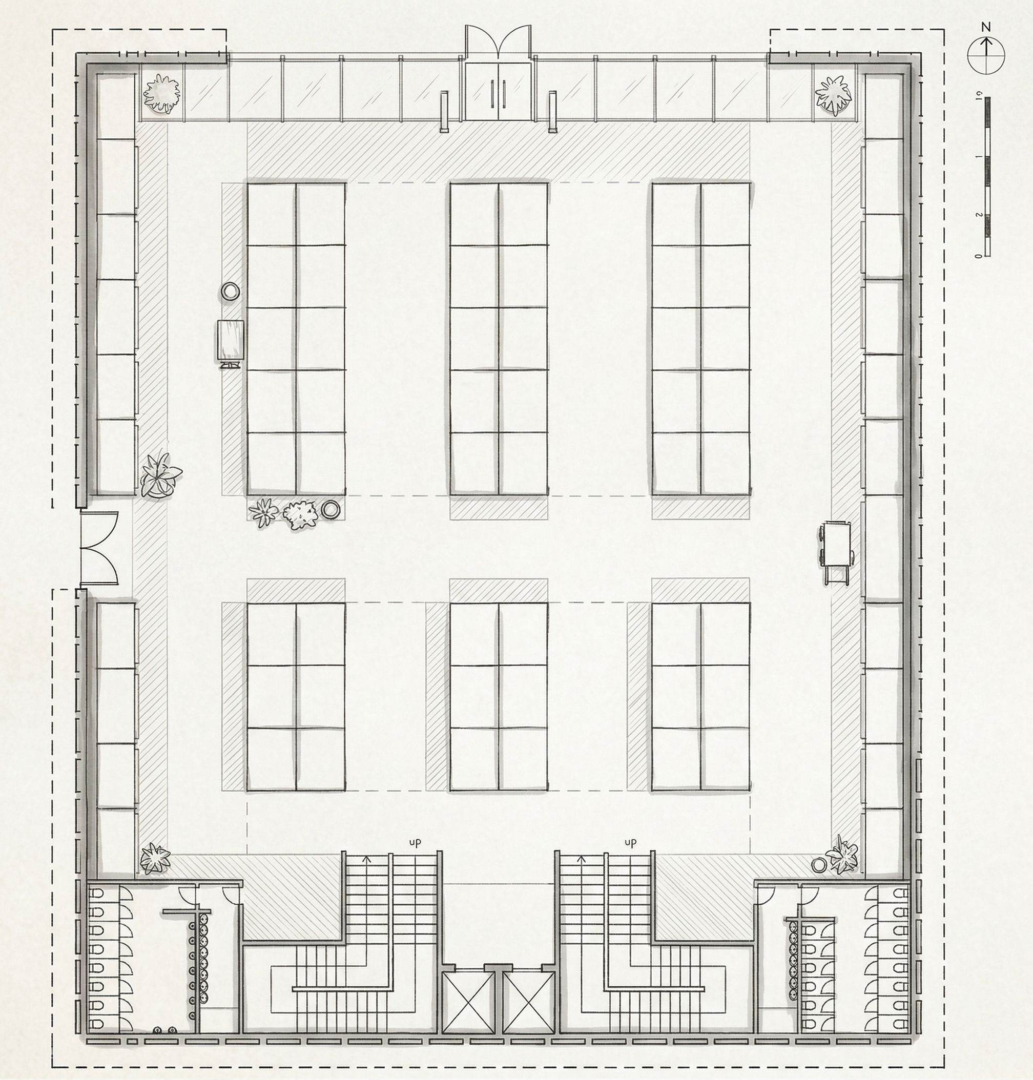 Refine this architectural floor plan of a market hall. Keep the original building shape, symmetry, and overall layout strictly unchanged. Preserve the symmetrical organization of the plan Maintain the main circulation direction toward the top side of the drawing, where there is a glass façade with the main entrance Keep the secondary entrance on the left side middle of the façade Organize the interior as a clear and simple market layout with regular stalls for vendors typical market hall logic Ensure stalls are arranged in a readable, structured grid, with clear aisles between them Keep circulation straightforward and intuitive, leading from entrances through the market Maintain existing sanitary zones: men’s WC in the bottom-left women’s WC in the bottom-right Add or refine an L-shaped staircase leading to the upper floor, with realistic proportions max 16 steps per flight + landing Keep the layout clean, logical, and buildable, avoiding unnecessary complexity Make it clearly readable as a market hall with vendor stalls and public movement Style: clean architectural floor plan, precise black line drawing, hand-drawn or soft architectural sketch style, no text labels, keep exact camera angle