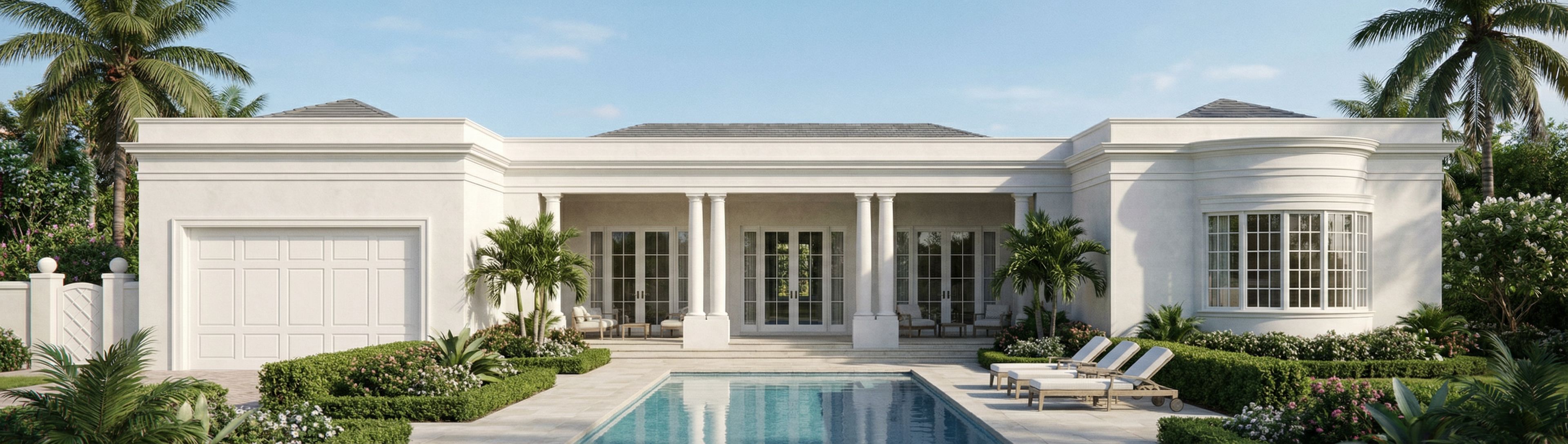 Exterior material is smooth white stucco with subtle natural variation and realistic surface texture. crisp and refined with clean profiles and delicate shadow lines. There should be a natural subtle variation between the colors of white in the architectural elements as you would find in real life.